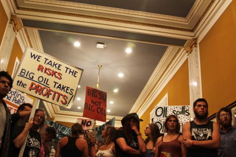 Montana Governor Brian Schweitzer talks with anti-pipeline/megaload protesters who swarmed his office at the Capitol (Independent Record/Dylan Brown photo).