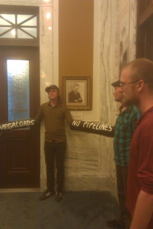 Activists of Northern Rockies Rising Tide and Wild Idaho Rising Tide lock down in a mock pipeline in Governor Brian Schweitzer’s office (Northern Rockies Rising Tide photo).
