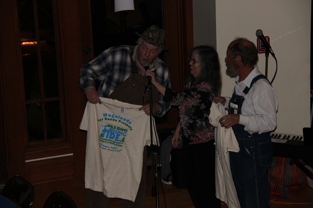 Wild Idaho Rising Tide presented Cass Davis (left) and Jim Prall (right) with commemorative T-shirts honoring their megaload blockade bravery (Tom Hansen photo).