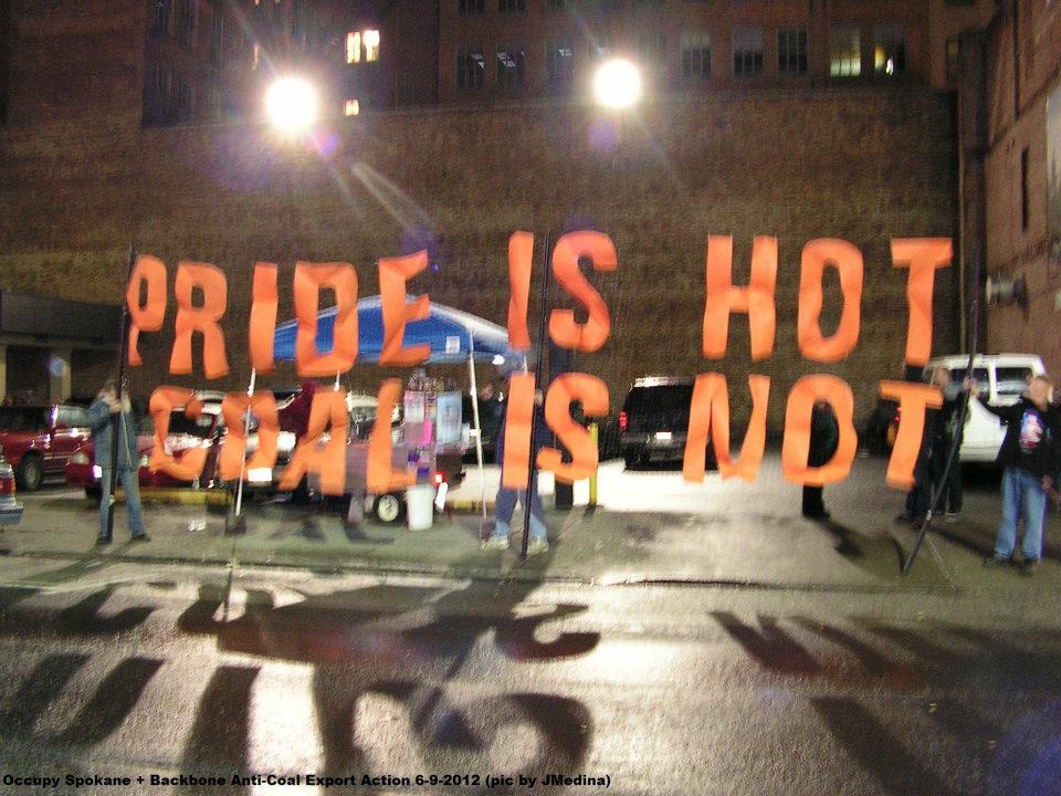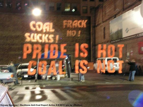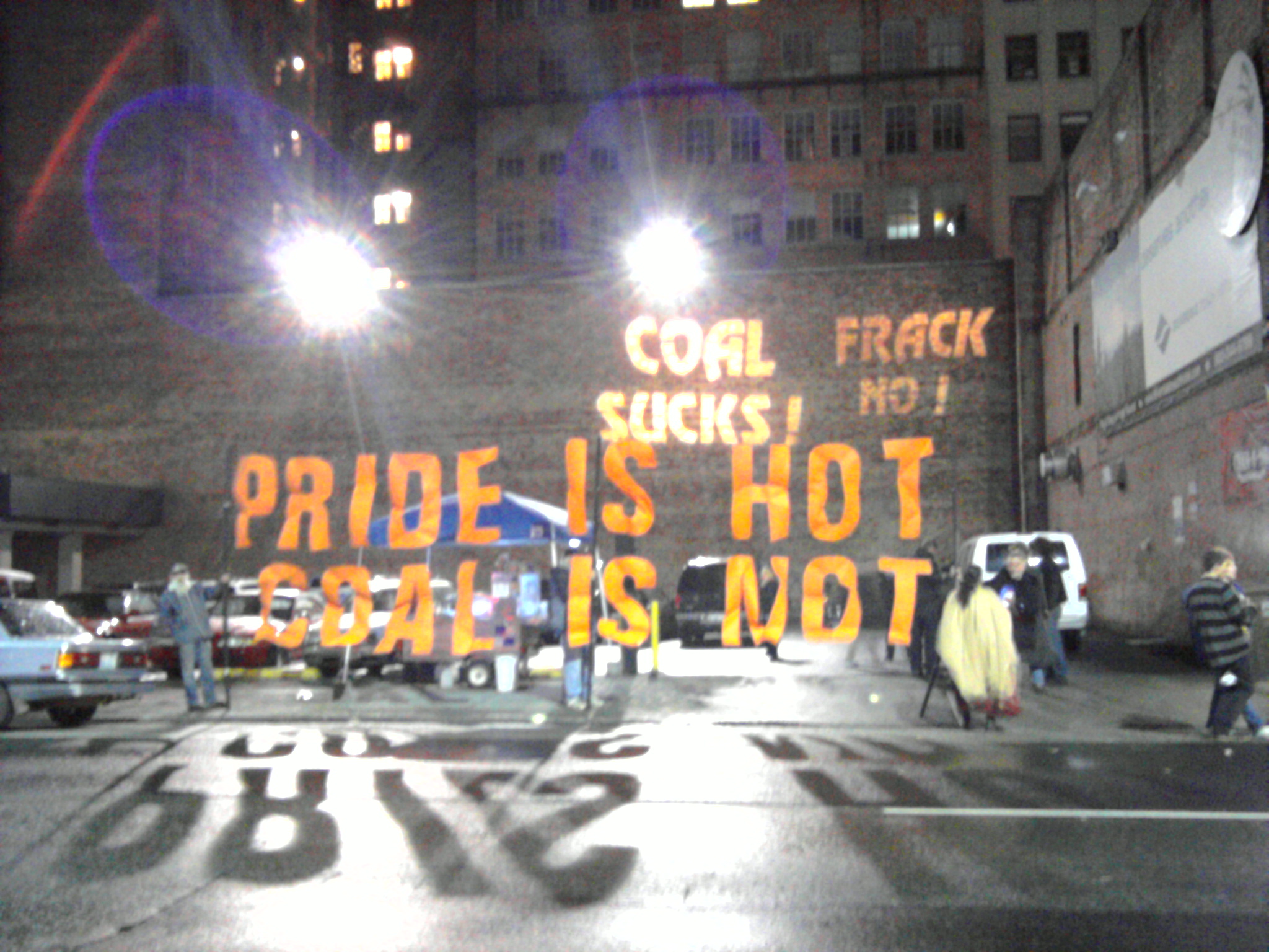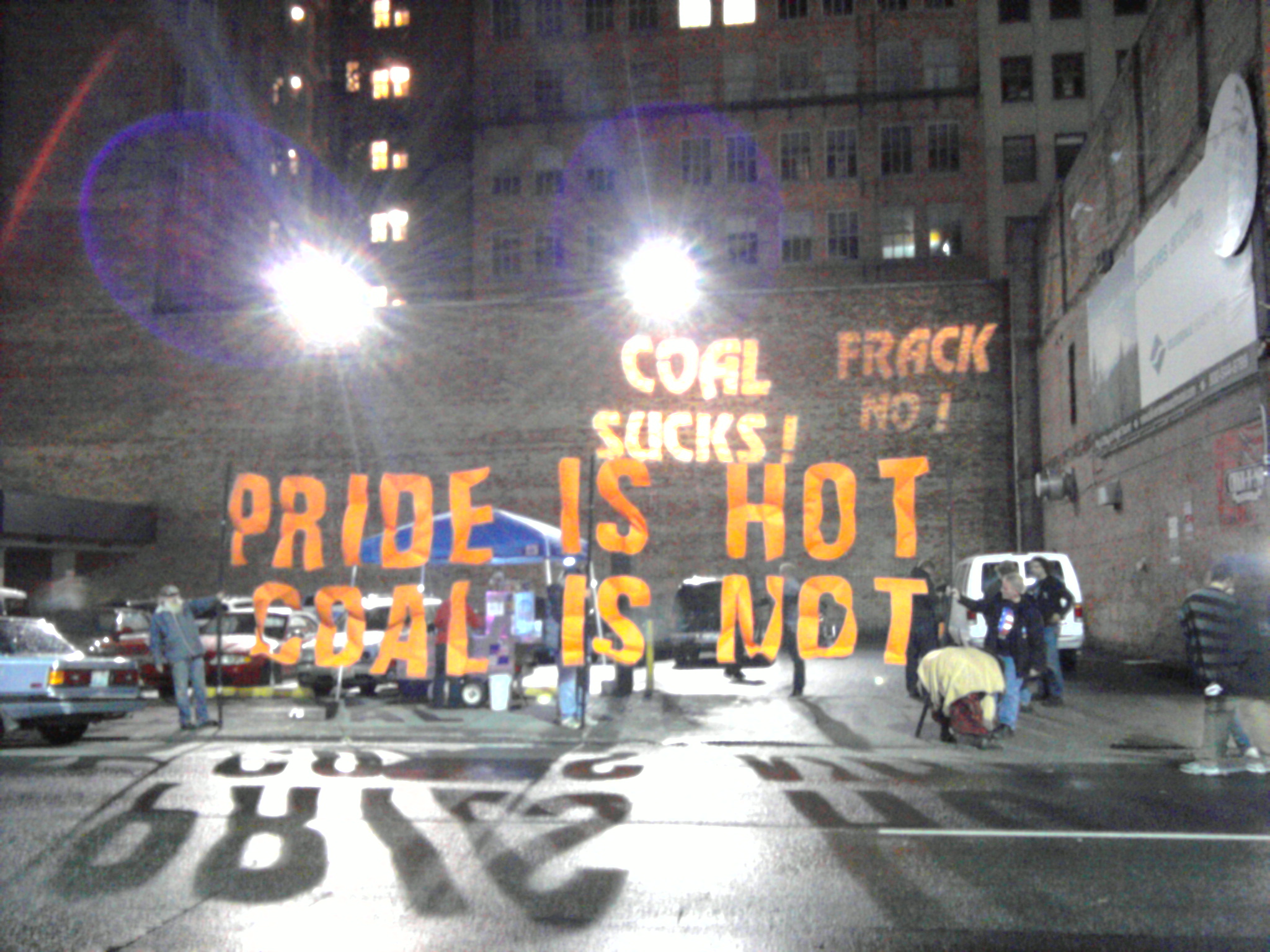 As the culminating action of the weekend direct action training sessions at the Northwest Extraction Resistance Workshop, activists held up a giant, plastic mesh banner and projected anti-coal export and -fracking “bat signals” on the wall across the street from local LGBTQ hangout, Irv’s Bar, in downtown Spokane, Washington, on the Saturday celebratory evening of the Pride event on June 9. Photos by Joan Medina and Helen Yost feature workshop trainers Kim Marks and Jasmine Zimmer-Stucky of Portland Rising Tide, Bill Moyer of Backbone Campaign, and participants Dave Bilsland, Terry Hill, Joan Medina, and Richard Schmidt of Occupy Spokane and Helen Yost of Wild Idaho Rising Tide.