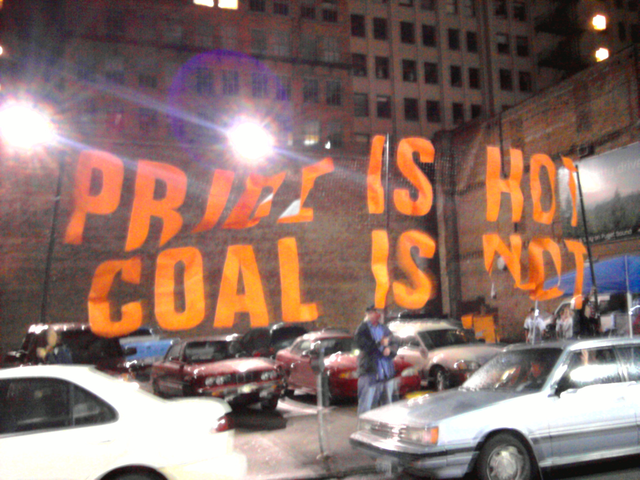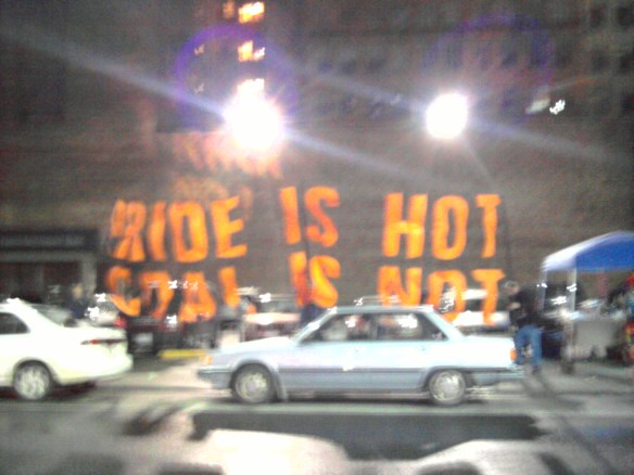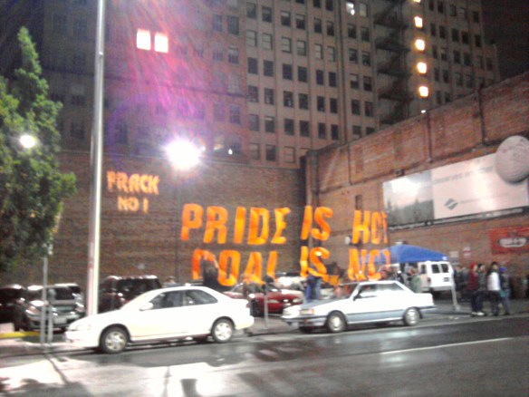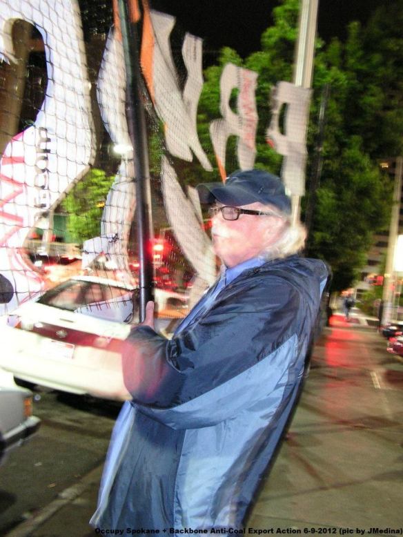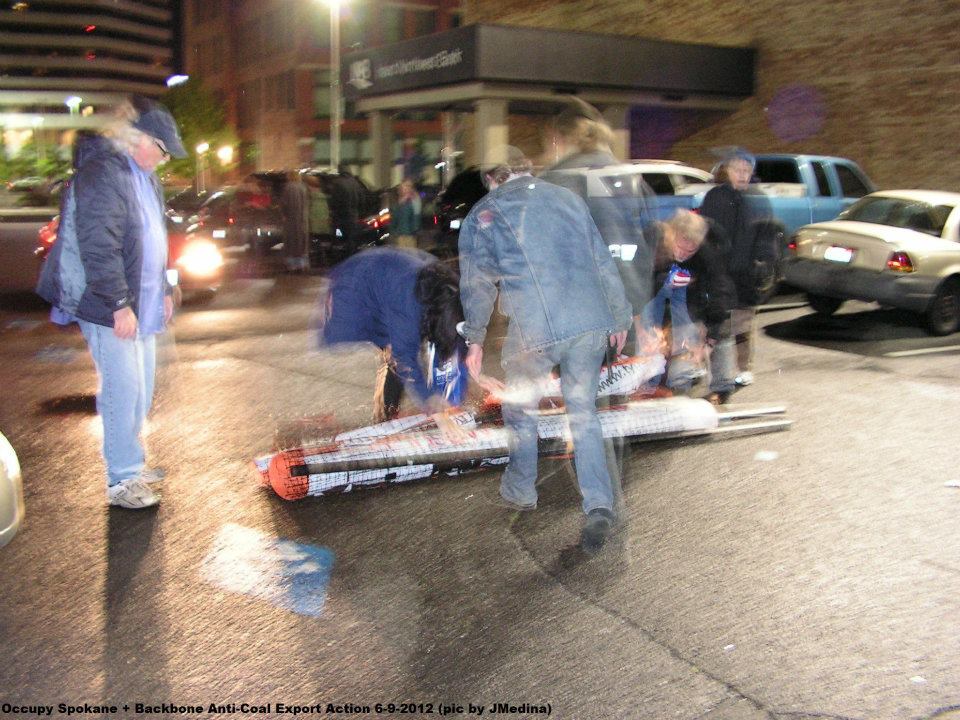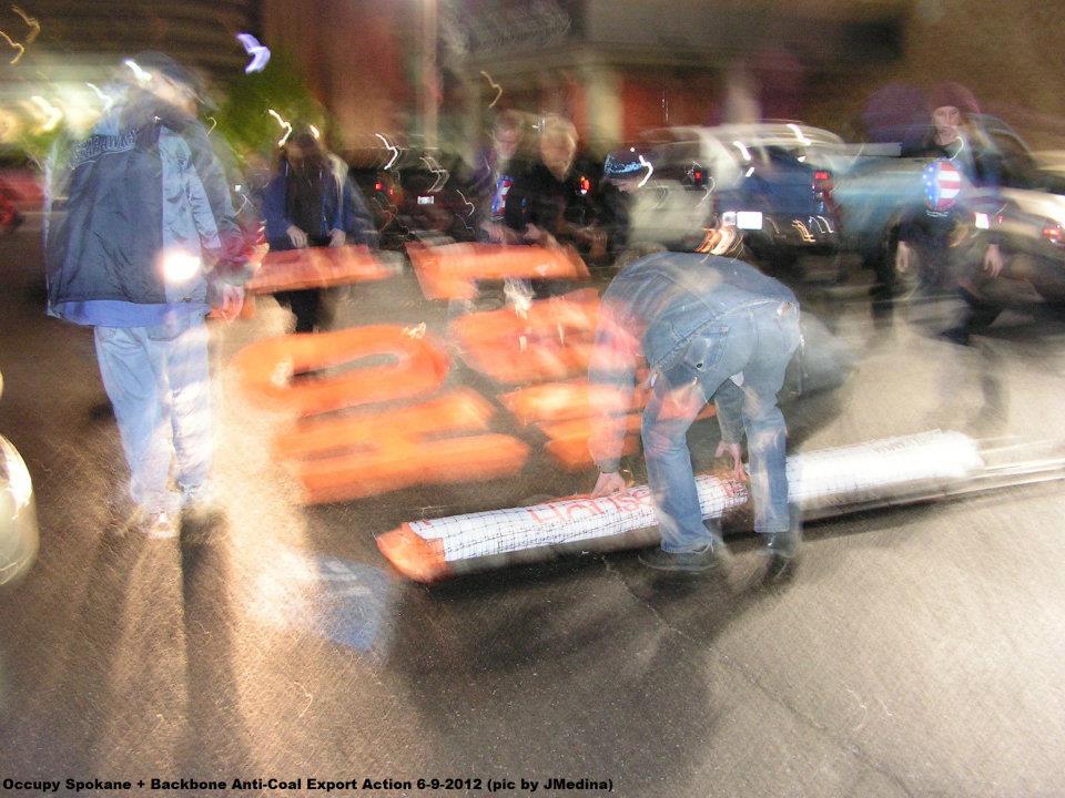 As the culminating action of the weekend direct action training sessions at the Northwest Extraction Resistance Workshop, activists held up a giant, plastic mesh banner and projected anti-coal export and -fracking “bat signals” on the wall across the street from local LGBTQ hangout, Irv’s Bar, in downtown Spokane, Washington, on the Saturday celebratory evening of the Pride event on June 9. Photos by Joan Medina and Helen Yost feature workshop trainers Kim Marks and Jasmine Zimmer-Stucky of Portland Rising Tide, Bill Moyer of Backbone Campaign, and participants Dave Bilsland, Terry Hill, Joan Medina, and Richard Schmidt of Occupy Spokane and Helen Yost of Wild Idaho Rising Tide.