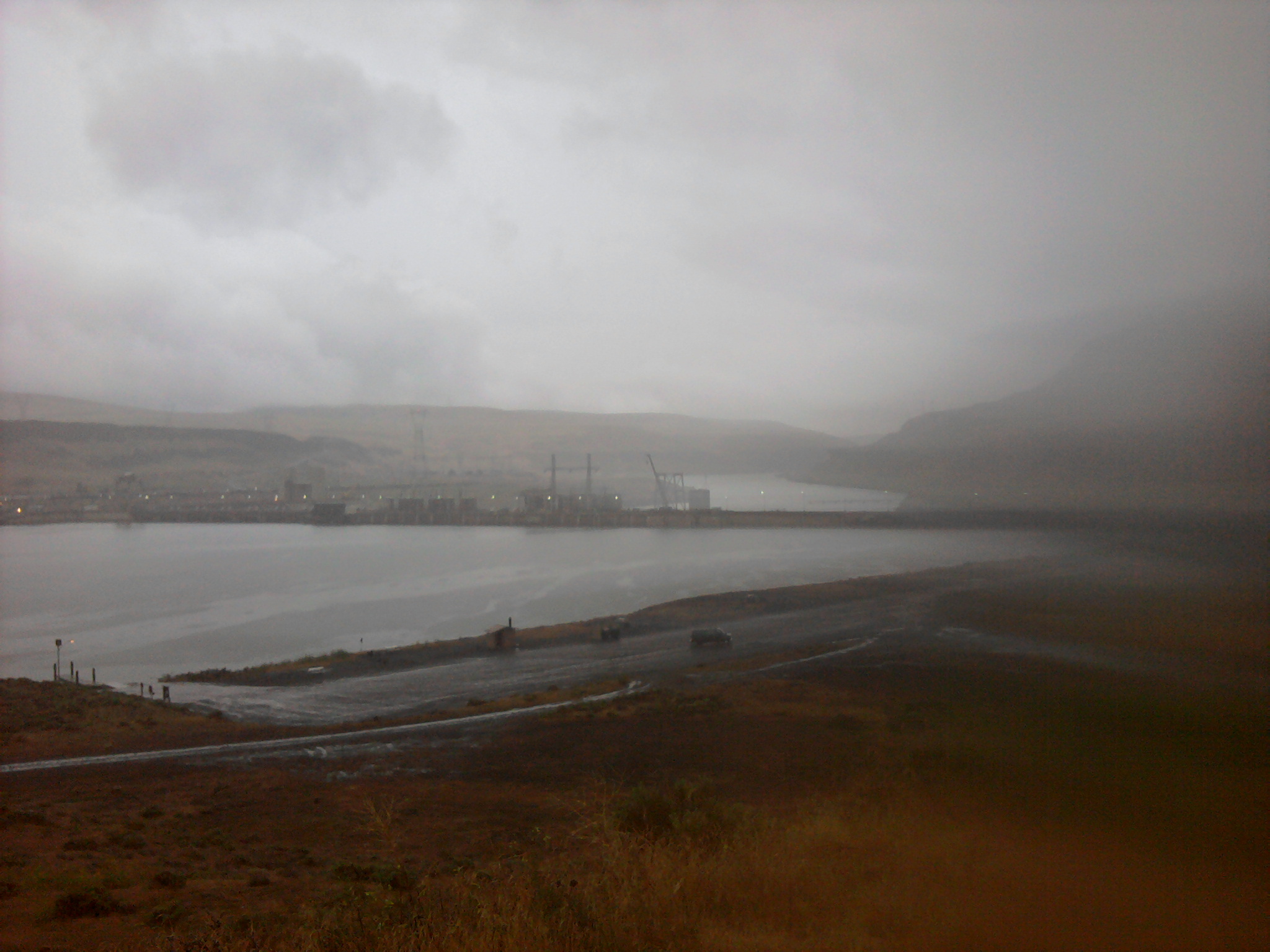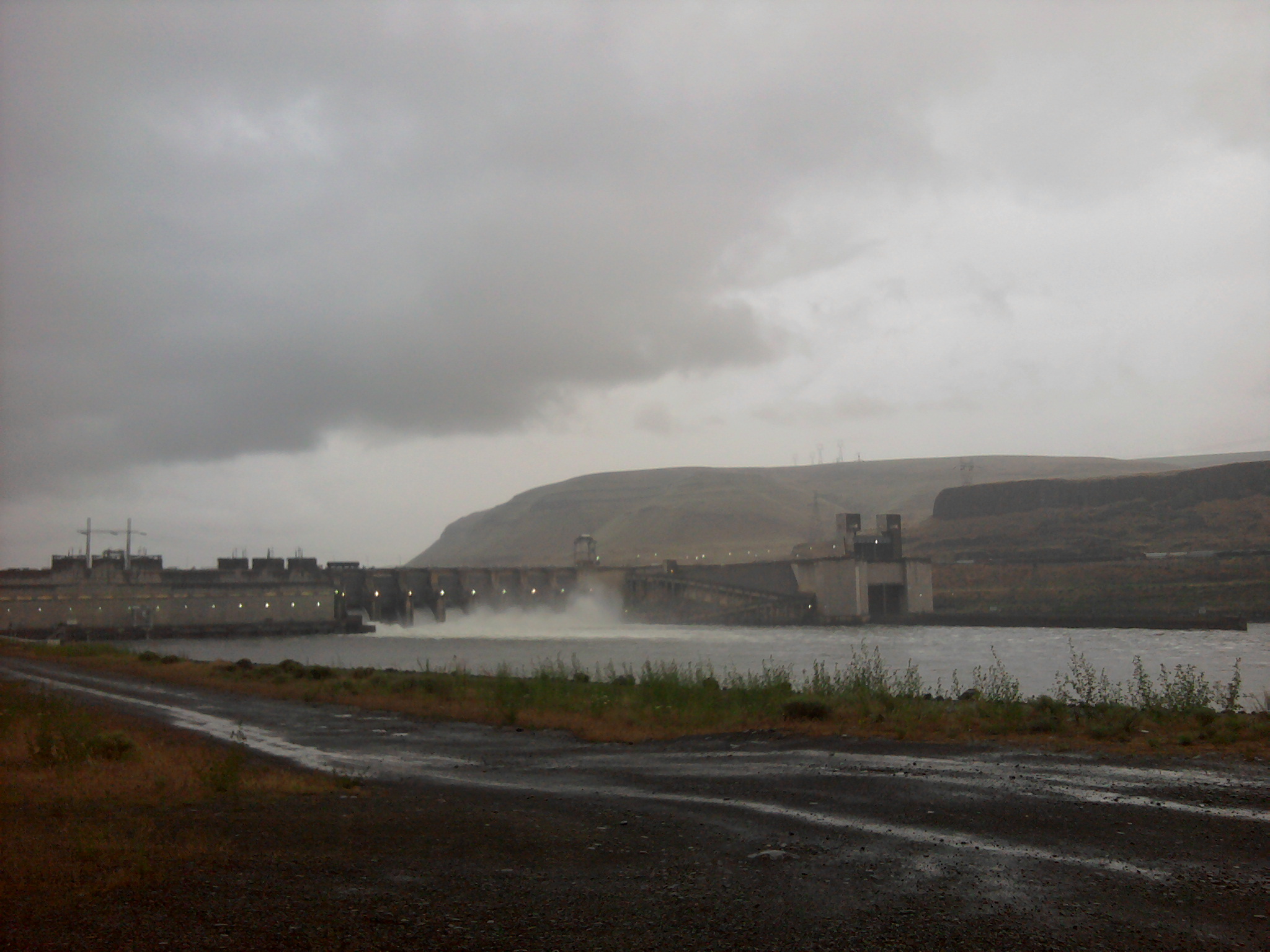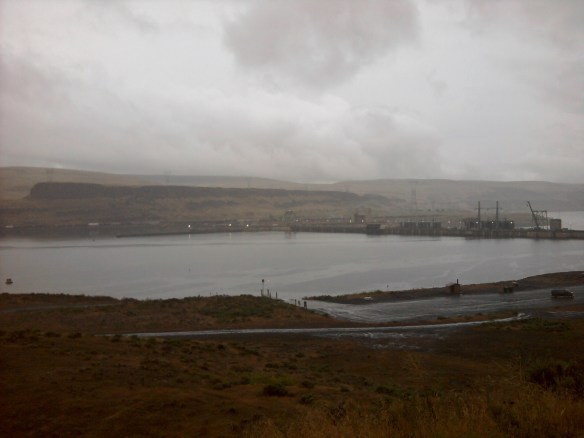While returning from Wild Idaho Rising Tide’s (WIRT) Tar Sands Megaloads Road Show of Tipping Point: The Age of the Oil Sands screening in Kennewick, Washington, on June 2, a lone WIRT activist saw rainbows, but heavy rain compromised dawn explorations of Lower Monumental Dam. If ExxonMobil/Imperial Oil or other companies barge more Alberta tar sands equipment to the Port of Lewiston, Idaho, the modules would move through the tallest structure on the downriver (right) side of the dam and out along the levee jutting upriver (left).