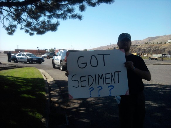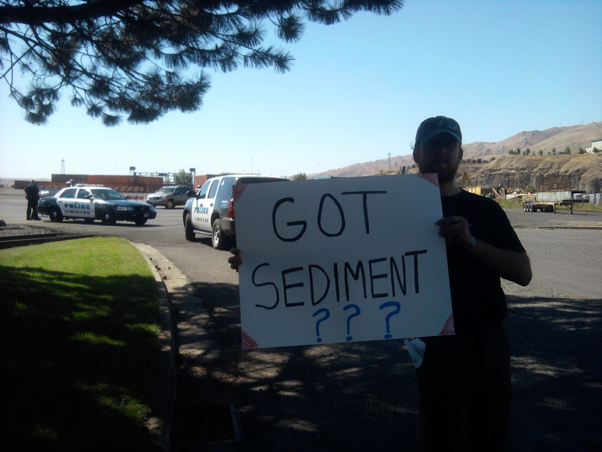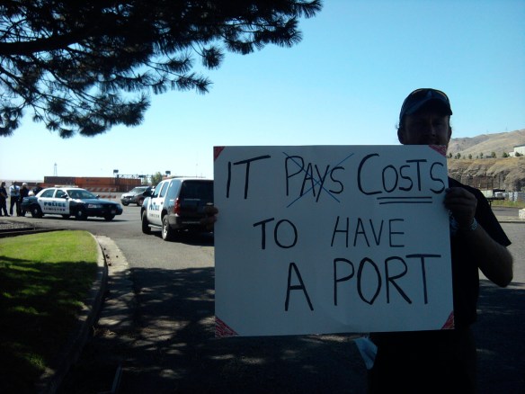 Members of Friends of the Clearwater, Great Old Broads for Wilderness, Northern Rockies Earth First!, and Wild Idaho Rising Tide protest the federally funded, proposed expansion of the container dock at the Port of Lewiston, Idaho, likely to accommodate tar sands equipment shipments, as U.S. Transportation Secretary Ray LaHood tours port facilities on Wednesday afternoon, August 22, with Idaho Governor Butch Otter, U.S. Senators Mike Crapo and Jim Risch, and 50 invited port customers, entrepreneurs, local elected officials, and reporters.