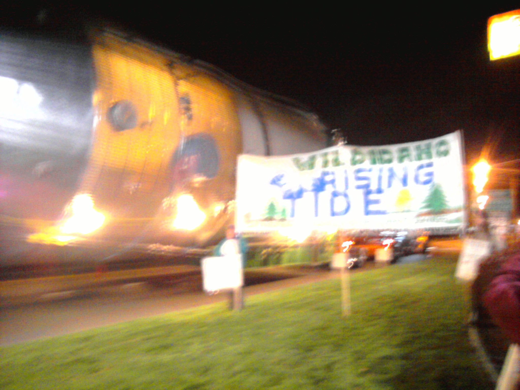 The Omega Morgan transport roars past Wild Idaho Rising Tide protesters in Lewiston, Idaho, on Monday night, October 22 (Cindy Magnuson photo).
