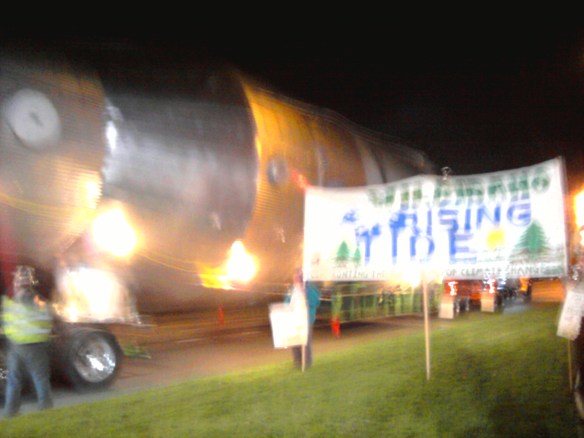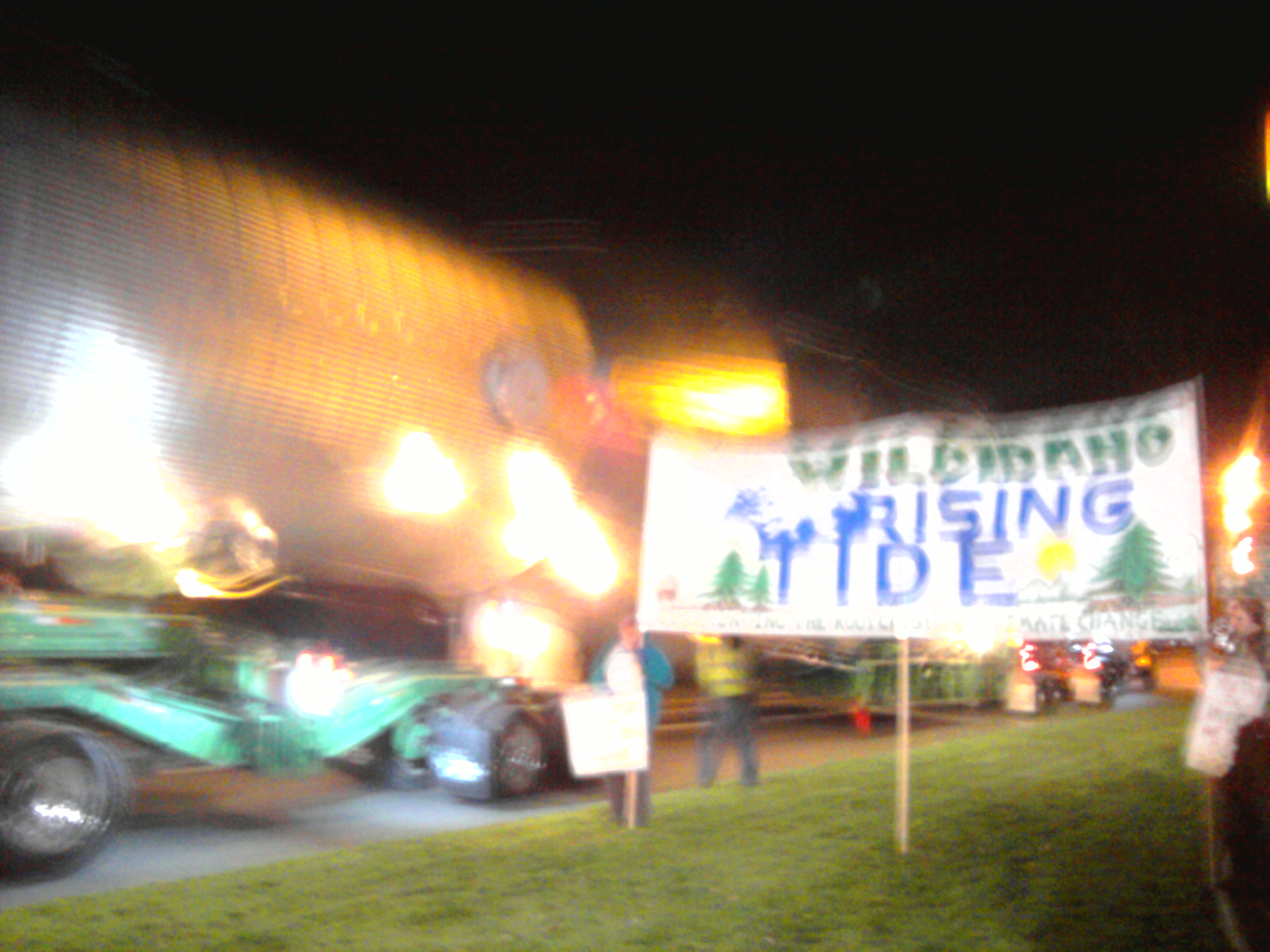The largest megaload that Wild Idaho Rising Tide has ever confronted, the Omega Morgan module encounters opposition a few miles into its 1000-mile-plus journey to Alberta tar sands operations.