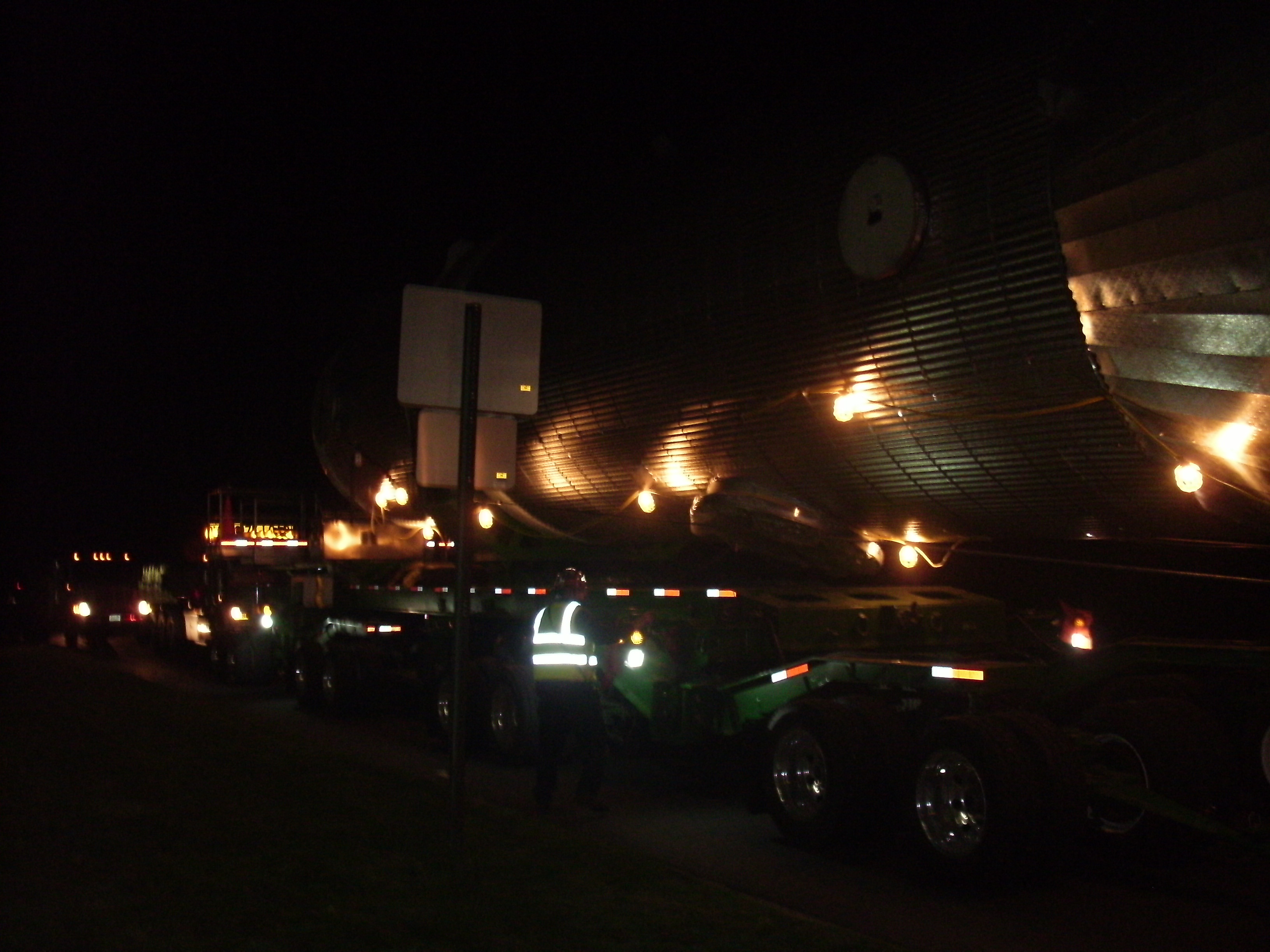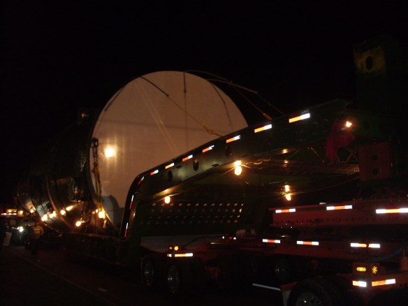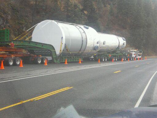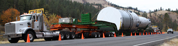 The cylindrical Omega Morgan module rolls toward the Lewiston intersection of Idaho Highway 128 and U.S. Highways 12/95 (Cindy Magnuson photo).