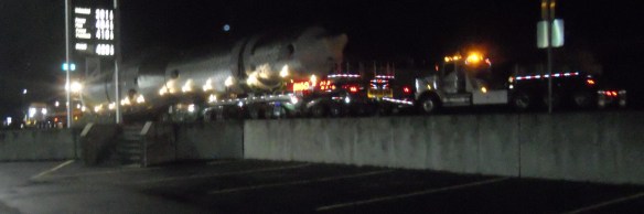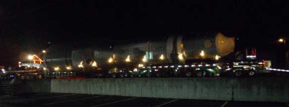 The Omega Morgan megaload temporarily stopped along Highway 12 in downtown Kamiah on the Nez Perce Reservation on Tuesday night, October 23-24 (Greg Mack photo).