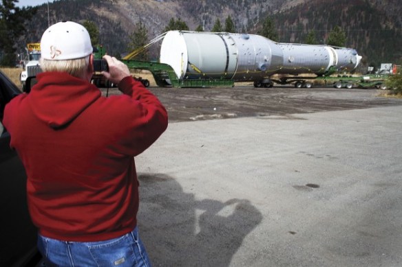 Dave Kapczynski of Ellensburg, Washington, snaps a picture of an oversized load of water purification equipment at the Town Pump Truck Plaza parking lot in West Riverside on Wednesday (Missoulian/Thom Bridge photo).