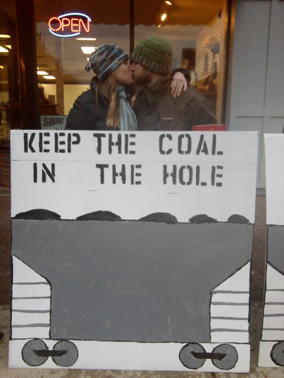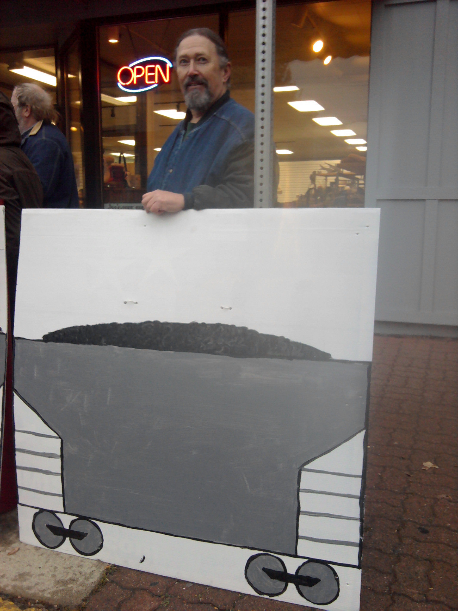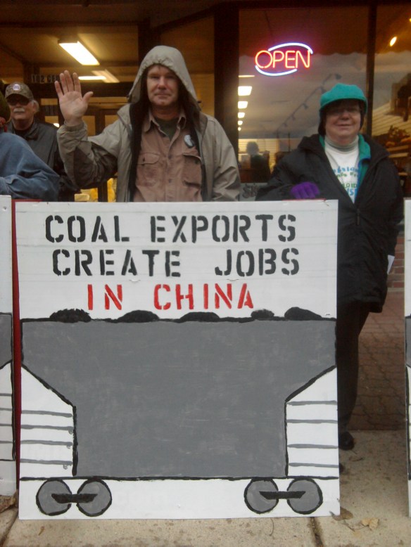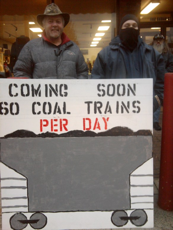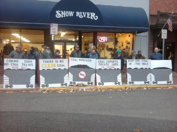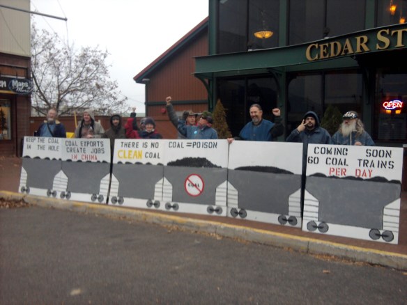 On Saturday, November 17, between noon and 4 pm, two dozen activists from Occupy Spokane and Wild Idaho Rising Tide (WIRT) converged in several high vehicle and pedestrian traffic areas in Sandpoint, Idaho, with a people’s train of “rail car” protest signs, sidewalk parades, and chants. Rebuking schemes for five coal export facilities on the Columbia River and Washington and Oregon coasts and increased toxic coal train traffic from Montana and Wyoming across the Northwest, demonstrators distributed coal issue flyers and door hangers, encouraged northern Idaho participation in December 4 scoping hearings in Boardman, Oregon, and Spokane, Washington, on proposed Coyote Island and Cherry Point coal terminals, and mobilized a network of activists for direct actions at the hearings and in the field before respective December 12 and January 21 public comment deadlines. As federal, state, and county decision makers and industry perpetrators of pollution and climate change discount the concerns of communities most adversely affected by potential coal export train traffic through eastern Washington, Idaho, and Montana, by staging distant opportunities for purported public input, anti-coal organizers are demanding rescheduling of the overlapping hearings, a mine-to-port programmatic environmental impact study and statement for all coal export proposals, and hearings in Idaho and Montana to expand the current exclusionary scoping process.