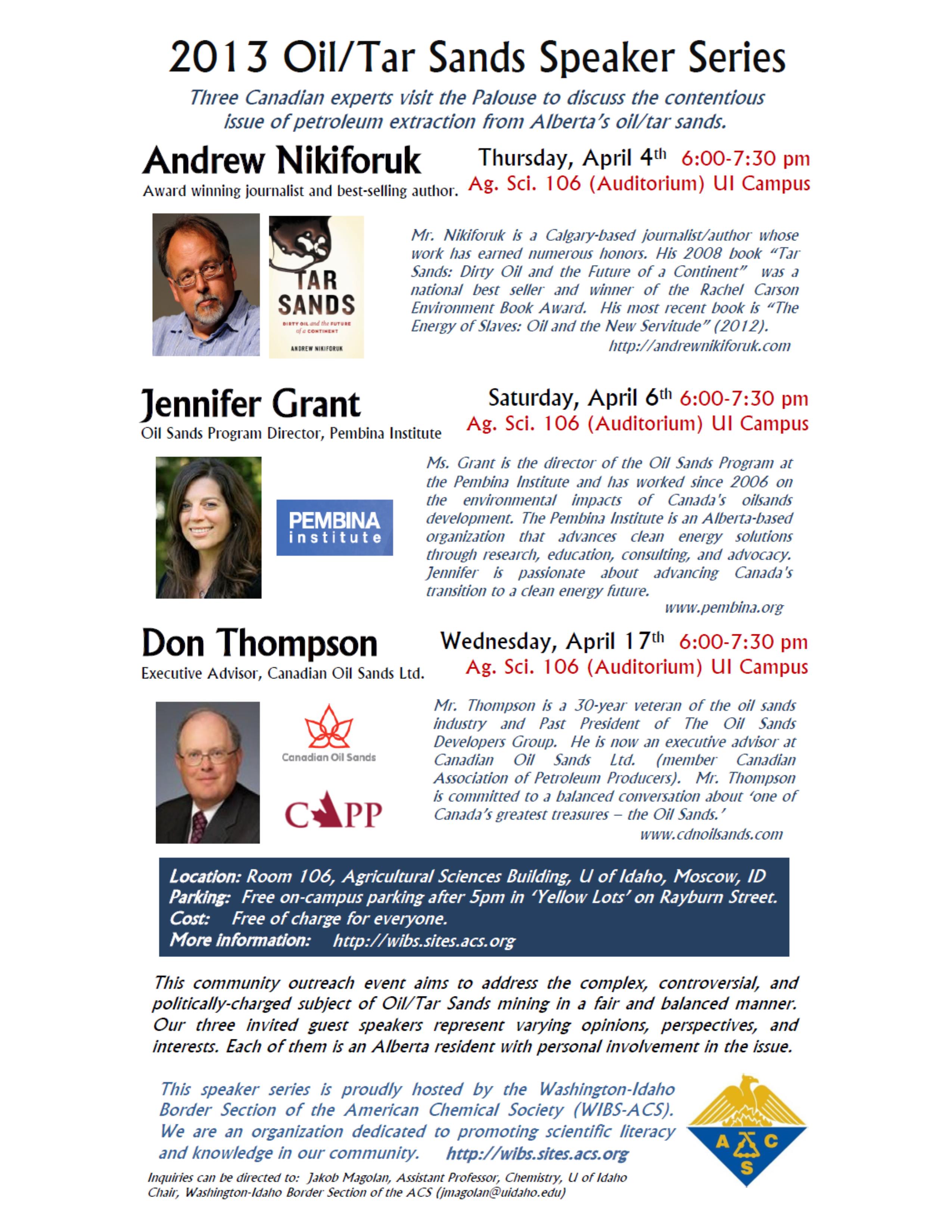 On three April evenings between 6 and 7:30 pm in the UI Agricultural Sciences Auditorium, Room 106, ACS is hosting outreach events to address in a “fair and balanced manner” the complex, controversial, and politically-charged subject of Alberta tar sands mining. Dedicated to promoting scientific literacy and knowledge, regional ACS members have invited three Canadian experts, each Alberta residents with personal involvement and varying opinions, perspectives, and interests in this contentious issue, to visit the Palouse. We hope that you will avail yourself and our community of these opportunities to expand the awareness and activism of our growing dirty energy resistance movement. Participants in all three public and free discussions on the UI campus can park after 5 pm in the ‘yellow’ lots on Rayburn Street in Moscow.