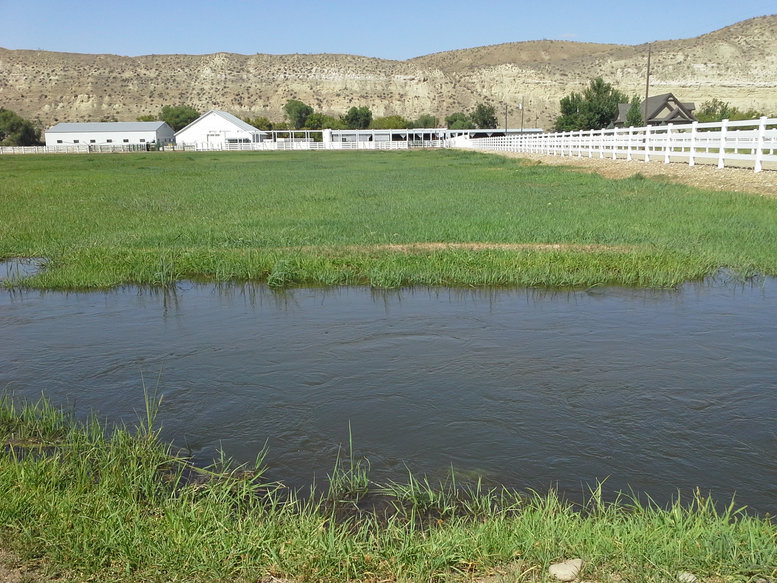Across Highway 52 to the north, working ranches, community irrigation canals, and distantly recognizable sandstone cliffs and bluffs lie in close proximity to the directionally drilled and potentially fracked Smoke Ranch natural gas well, within a river confluence and wetlands floodplain.