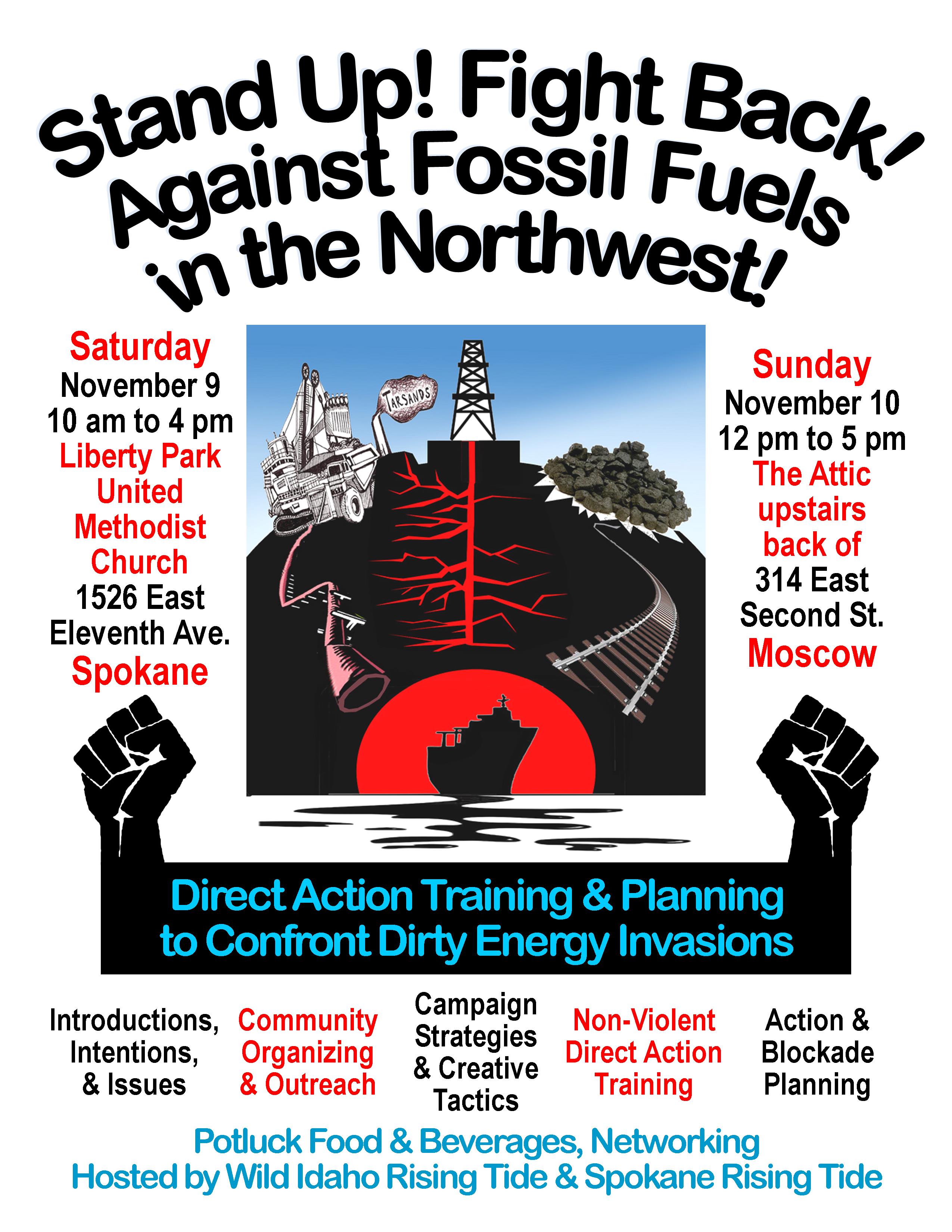 Wild Idaho Rising Tide and Spokane Rising Tide activists enthusiastically invite regional community members eager to design and stage arrestable protests to the second Stand Up! Fight Back! Against Fossil Fuels in the Northwest! information sharing, brainstorming, and strategizing session. Opponents of coal, fracked natural gas and oil, and tar sands extraction and transportation projects are converging from northern Idaho and eastern Washington for these urgent non-violent direct action training and planning workshops. Duplicate gatherings will occur between 10 am and 4 pm on Saturday, November 9, at the Liberty Park United Methodist Church, 1526 East Eleventh Avenue in Spokane, Washington, and from 12 noon to 5 pm on Sunday, November 10, at The Attic, up the back stairs of 314 East Second Street in Moscow, Idaho. Workshop participants will learn direct action methods as they share their experiences protecting the public environment and health from corporate pillage, while preparing to confront coal and shale oil trains before November 18 port scoping period deadlines as well as the next tar sands megaloads when they move through the region to Alberta.
