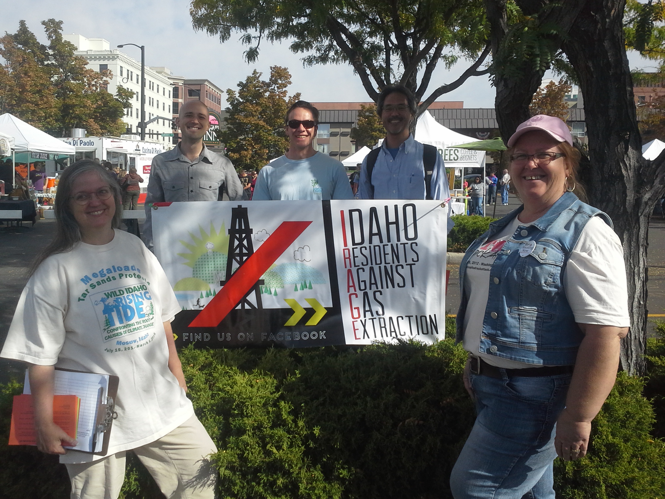 In conjunction with the Global Frackdown worldwide day of action on Saturday, October 11, Idaho Residents Against Gas Extraction, Palouse Environmental Sustainability Coalition, Wild Idaho Rising Tide, and other groups and individuals arranged and supported Global Frackdown Idaho for a third year in Boise and for the first time in Moscow.  To publicly oppose fracking, concerned citizens and climate justice activists from across Idaho converged and staged demonstrations, calling for a ban on looming first fracking in Idaho and around the Earth.  In response to state and local policy makers and administrators and in solidarity with harmed communities and wrongfully jailed and hunger-striking Idaho fractivist Alma Hasse, protesters gathered with family, friends, neighbors, signs, and banners at the Boise and Moscow farmers markets.  Event coordinators provided verbal descriptions and printed information about the current state of oil and gas development and resistance in Idaho, as they circulated and signed a petition to state officials and considered a ballot measure, to ban fracking, waste injection wells, and all toxic oil and gas practices statewide.  At both events, participants expressed their outrage over government complicity with industrial harms to shared air, water, climate, and community, as they demanded that Idaho officials secure a future powered by clean, renewable energy, not by dirty, polluting fossil fuels that poison people and the planet.