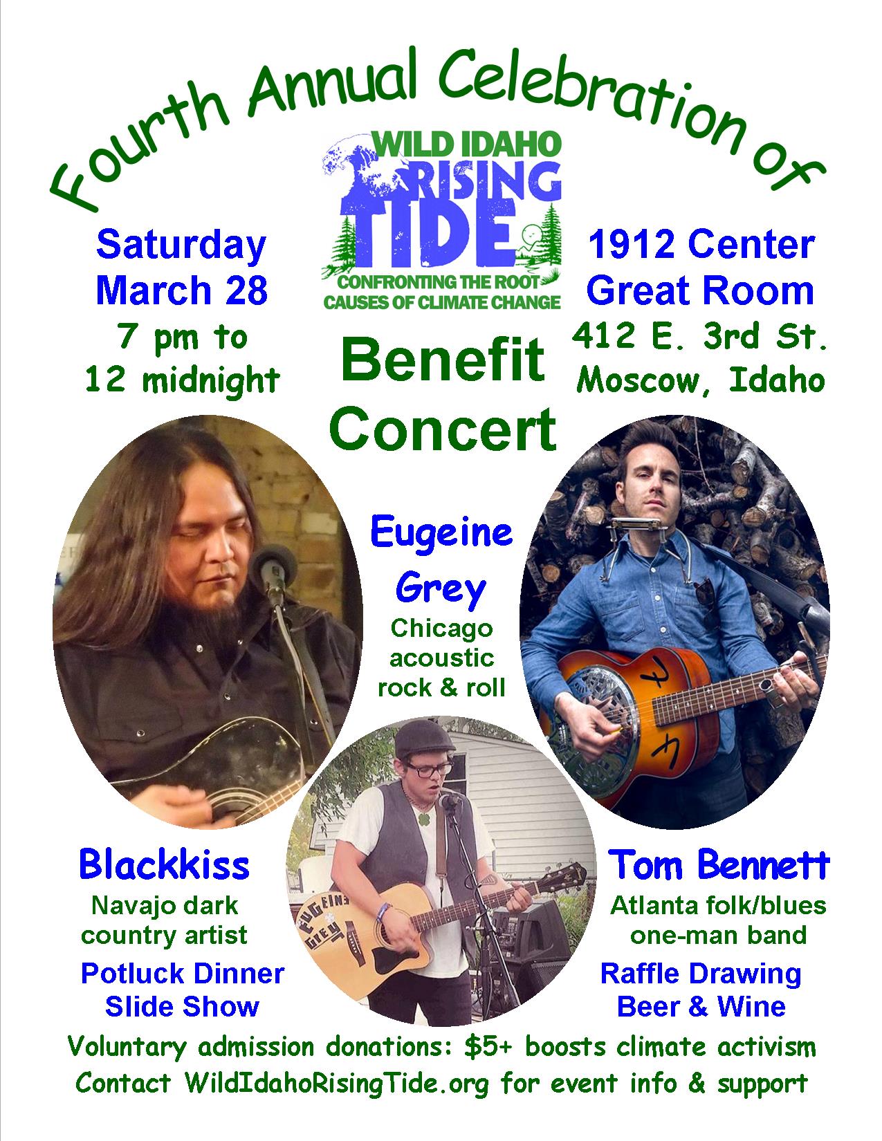 March 28: Fourth Annual Celebration of Wild Idaho Rising Tide benefit concert with a potluck, beer and wine, and slide show (Saturday 7 pm to midnight, 1912 Center Great Room, 412 East Second Street, Moscow, Idaho) Please contact WIRT to volunteer.