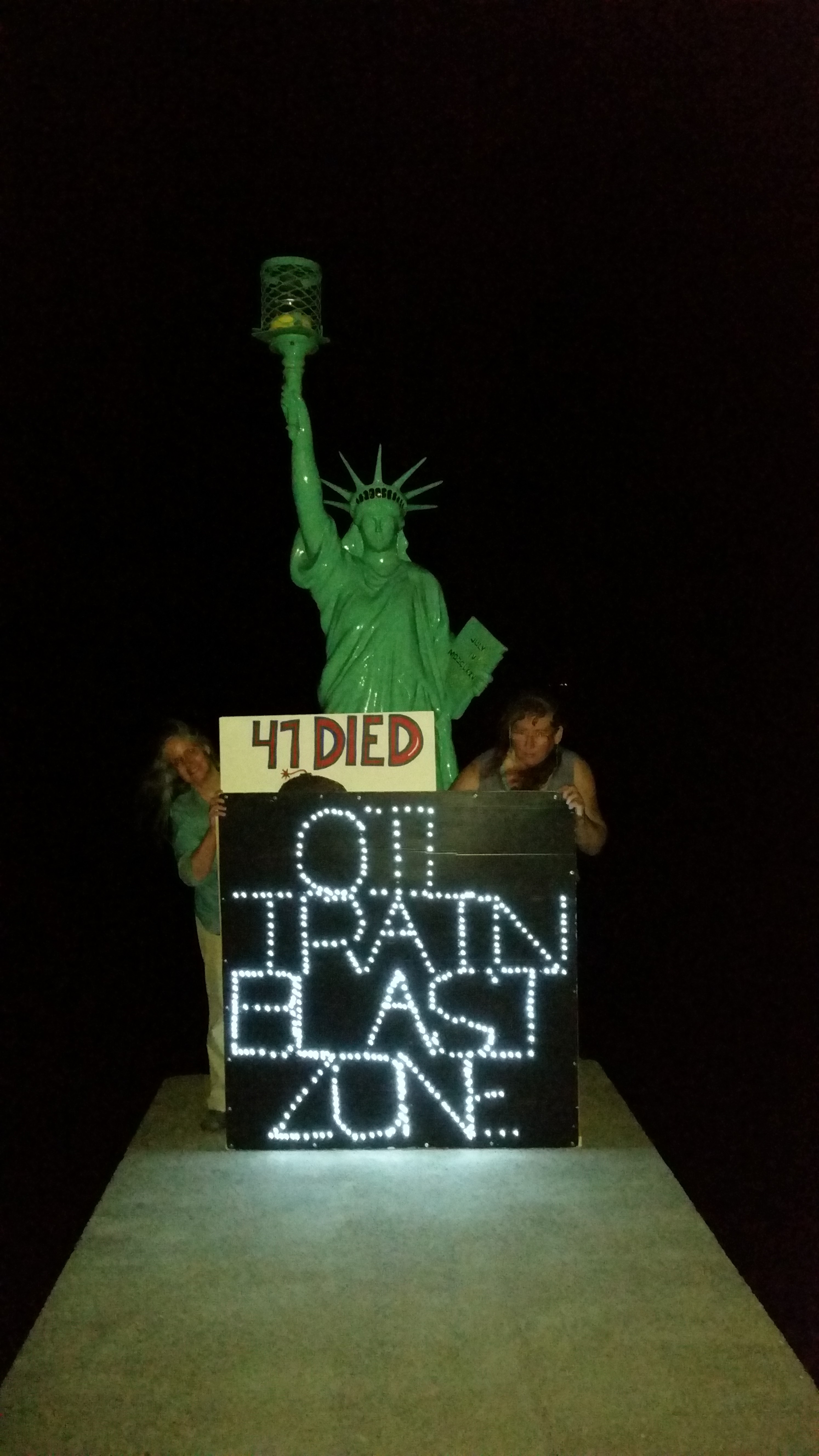 Lastly, we went to City Beach Park, to highlight the destination’s isolated vulnerability if a bomb train ever exploded near downtown Sandpoint. Holding a sign with letters shaped by miniature lights saying “Oil Train Blast Zone” and another regular poster that stated “47 Died,” we posed for pictures in front of Sandpoint’s iconic Lady of the Lake, a small version of the Statue of Liberty located at the end of a short pier overlooking Lake Pend Oreille, on the southeast side of the park [10]. Our signage again drew attention and helped us reach out to the community and engage it in conversations about the dozens of oil trains that rumble within feet of the surrounding, popular recreation site, typically densely populated during the summertime.