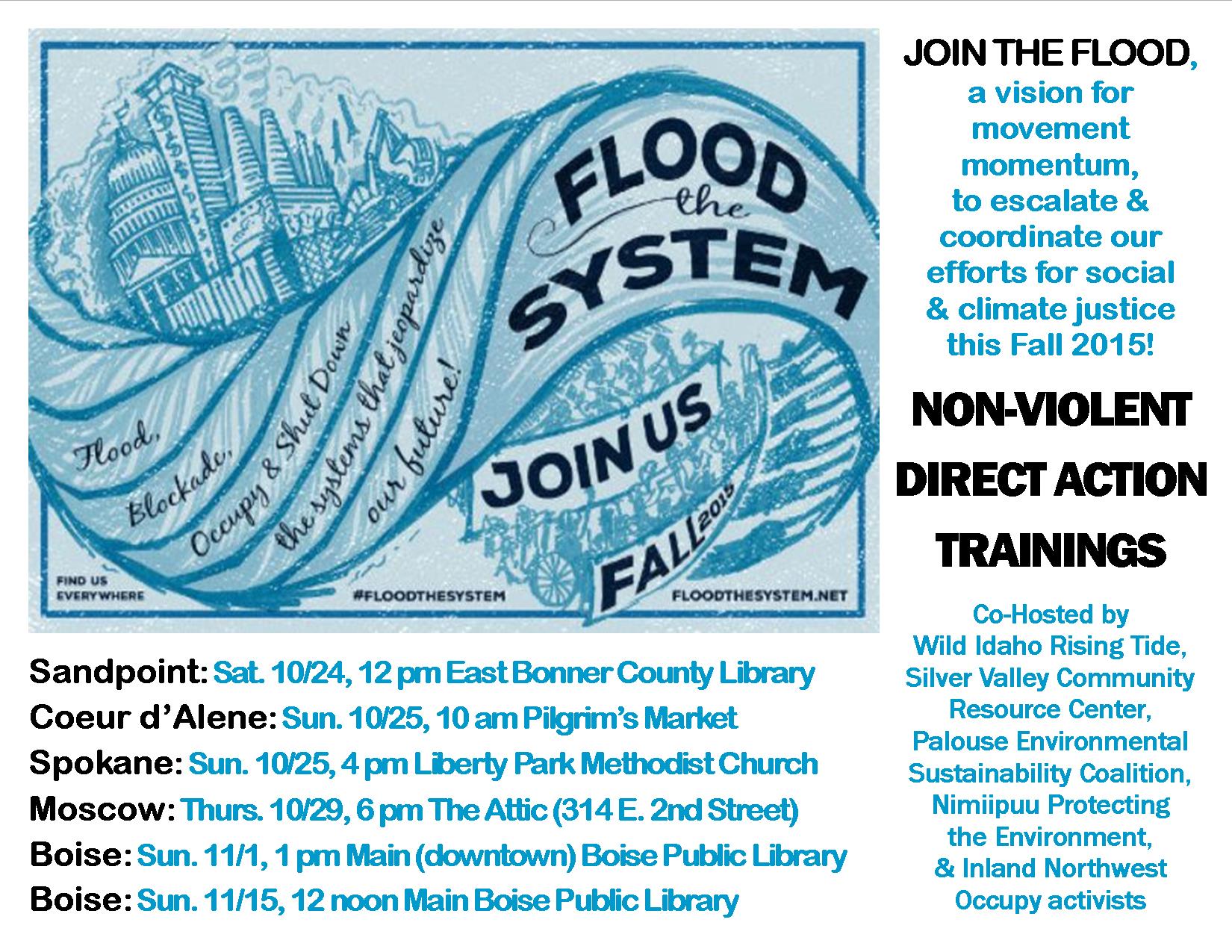 Wild Idaho Rising Tide, Silver Valley Community Resource Center (SVCRC), Nimiipuu (Nez Perce) Protecting the Environment, Palouse Environmental Sustainability Coalition (PESC), and inland Northwest Occupy activists invite you to attend these #FloodtheSystem trainings, presented by Rising Tide organizers and trainers in close proximity to co-sponsoring groups: