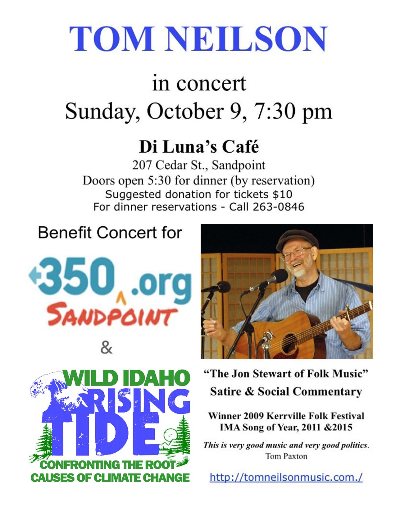 For this Sunday, October 9 benefit event, the doors open at 5:30 pm for optional dinner by reservation at Di Luna’s Café, 207 Cedar Street in Sandpoint, Idaho. Please call Di Luna’s at 208-263-0846 for your reservation. Activist musician Tom Neilson begins his performance there at 7:30 pm, for $10 suggested donations supporting 350Sandpoint and WIRT.