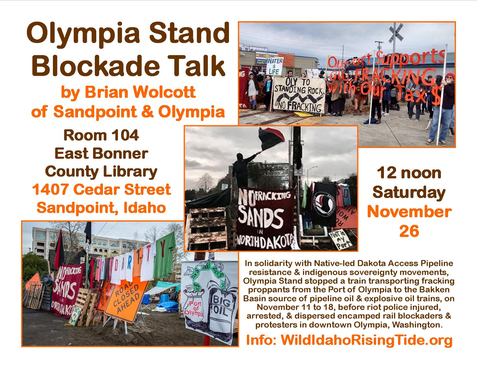 Please join Wild Idaho Rising Tide (WIRT) and allies at 12 noon on Saturday, November 26, in Room 104 of the East Bonner County Library, 1407 Cedar Street in Sandpoint, Idaho, for a public presentation offered by Brian Wolcott, an Evergreen College student, Olympia Stand activist, and Sandpoint resident. With photos, videos, and descriptions, Brian will talk about the week-long Olympia Stand blockade of a train transporting Chinese fracking proppants from the Port of Olympia to the Bakken shale oil and gas fields in North Dakota, the source of leaky pipeline oil and explosive oil trains. Between November 11 and 18, community demonstrations and an encampment on the tracks expressed solidarity with Native-led Dakota Access Pipeline resistance at the Standing Rock Reservation in North Dakota and with indigenous sovereignty movements defending the water, fishing, and hunting rights of local tribes, before riot police injured, arrested, and dispersed blockaders and protesters in downtown Olympia, Washington. For further event information, Olympia Stand media releases, regional and national news coverage of the blockade, and a donation site for arrestees’ legal funds, see the Olympia Stand public facebook group and the event announcement on the WIRT website [1, 2].