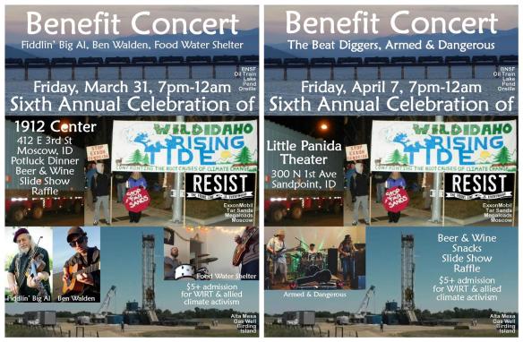Wild Idaho Rising Tide (WIRT) is celebrating its March 31, sixth anniversary as a regional, climate activist collective confronting the root causes and perpetrators of climate change through direct actions and locally organized solutions. We invite and welcome every one of all ages to share this milestone at two Sixth Annual Celebrations of Wild Idaho Rising Tide. These benefit concerts provided by five bands and solo musicians accompany potluck dinner and desert in Moscow, snacks in Sandpoint, beer and wine for purchase, dozens of raffle items donated by community members and businesses, and a background slide show of WIRT accomplishments. Come and enjoy our yearly fund and action raising parties offering radical revelry for participants supporting relentless, volunteer WIRT activism among and in solidarity with frontline communities of fossil fuel resistance and an international, grassroots network of activists.