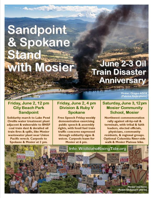 Please join Wild Idaho Rising Tide (WIRT) and Occupy activists and allies for carpools to Mosier, Oregon, and solidarity actions in Sandpoint, Idaho, and Spokane, Washington, to represent interior Northwest, rail-line communities solemnly remembering the June 3, 2016, oil train derailment, resulting devastation, and ongoing water contamination in Mosier.