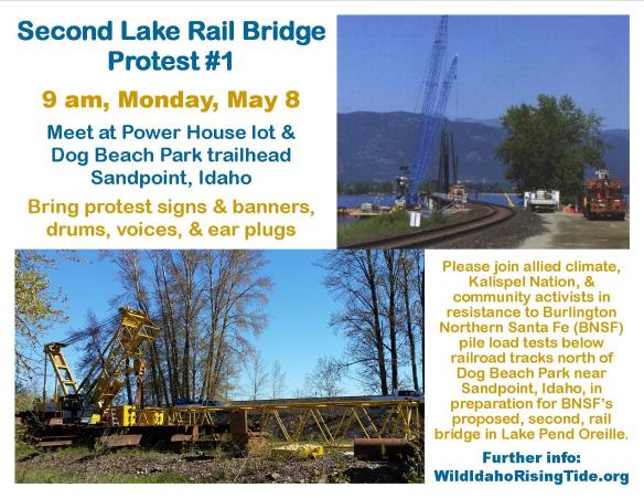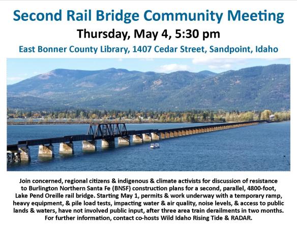 Wild Idaho Rising Tide (WIRT), RADAR, and allied, indigenous and climate activists are hosting a community meeting to discuss and design resistance to Burlington Northern Santa Fe (BNSF) plans for a second, parallel, rail bridge over Lake Pend Oreille and associated, potentially illegal, temporary ramps and heavy equipment on public lands and pile driven, load bearing tests in the lake, starting on Monday, May 1. Concerned, regional citizens are welcome to participate from 5:30 to 7:30 pm on Thursday, May 4, in Rooms 103 and 104 of the East Bonner County Library, 1407 Cedar Street in Sandpoint, Idaho.