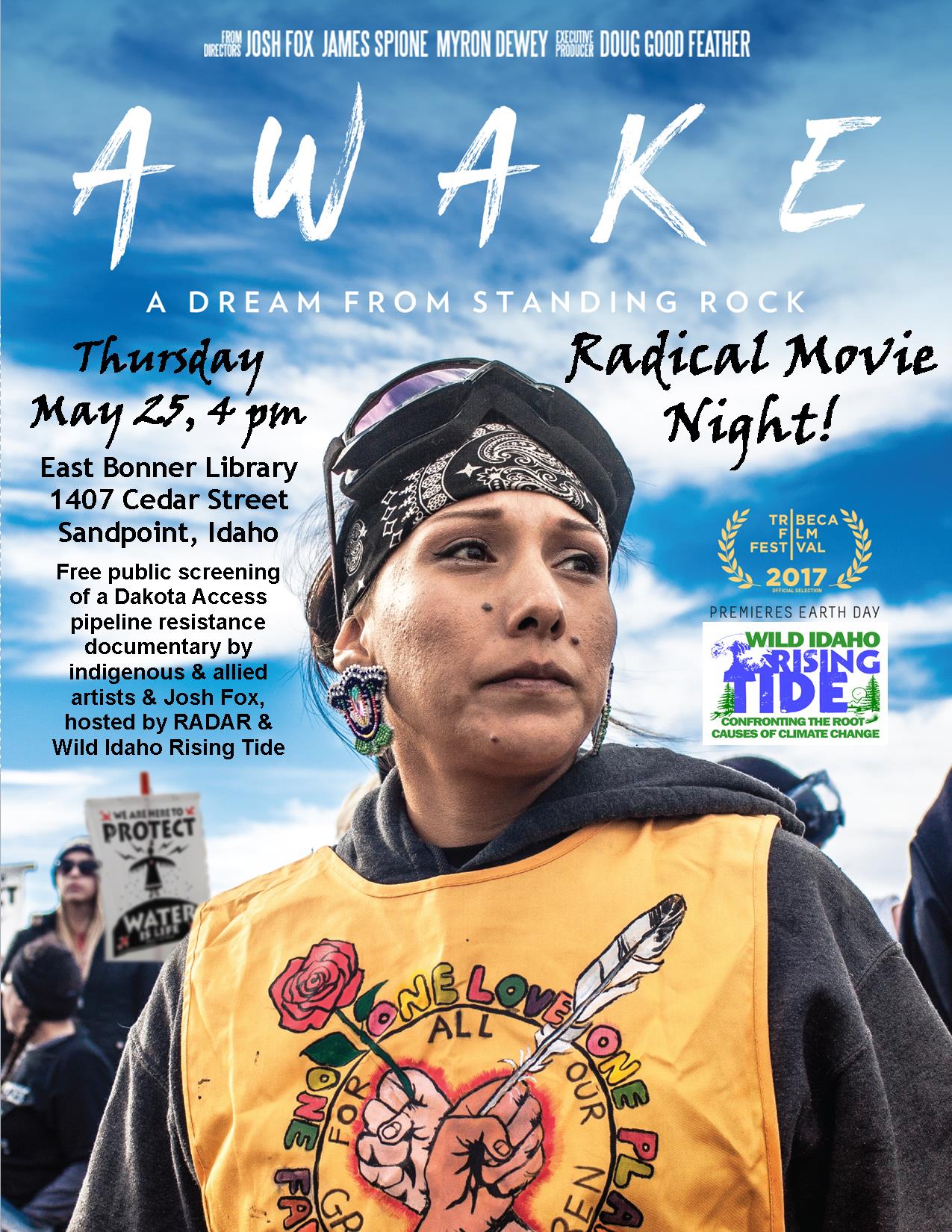 For the third Radical Movie Night! of the bi-monthly film series intended to inspire, challenge, and educate participants toward democracy, co-hosts RADAR and Wild Idaho Rising Tide (WIRT) offer a free, public screening of AWAKE, A Dream from Standing Rock, from 4 to 6 pm on Thursday, May 25, at the East Bonner County Library, 1407 Cedar Street in Sandpoint, Idaho. Please join this screening and discussion of current, regional, social and environmental struggles seeking just, sustainable, shared solutions. This documentary series and ongoing, radical and climate activism rely on physical and fiscal contributions from viewers and supporters. Peruse the following film description, drawn from the original AWAKE press release, and visit the enclosed links and WIRT website and facebook pages for further information resources.