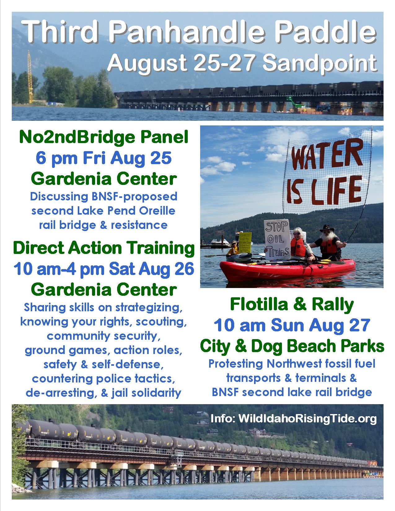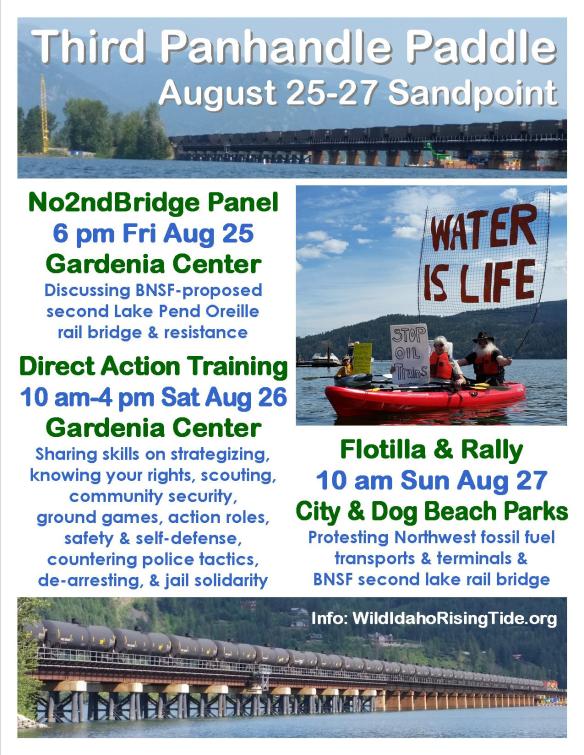 The Wild Idaho Rising Tide (WIRT) collective and allied activists, friends, and supporters invite and heartily welcome your input and involvement during an upcoming weekend of opportunities to discuss, train for, and stage resistance to the fossil fuel and railroad industry degraders of basic, global, human, environmental, and climate health and rights. In the wake of seven north Idaho and northwest Montana train derailments and collisions in five months, the disastrous, oil and coal train wrecks, spills, and pollution in the Columbia River Gorge village of Mosier, Oregon, and the upstream, Clark Fork River town of Heron, Montana, and Burlington Northern Santa Fe Railway’s (BNSF) north Idaho, double track construction and second, Lake Pend Oreille, rail bridge proposal and preparation, interior Northwest residents are rising up, organizing, and co-hosting third annual Panhandle Paddle activities, to stand against the volatile Alberta tar sands and fracked Bakken crude oil trains, dusty Powder River Basin coal trains, and fossil fuel infrastructure use, expansion, and deterioration that recklessly endanger our lives, communities, lands, water, air, and climate [1-3]. Please join us at these annual events at the Gardenia Center, City Beach Park, and Dog Beach Park in Sandpoint, Idaho, on August 25 to 27!