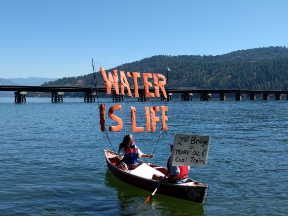 Thanks to each and all of the grassroots activists who converged from across the country, for third, annual, Panhandle Paddle activities co-hosted by Wild Idaho Rising Tide (WIRT) and allies, on August 25 to 27 in Sandpoint, Idaho. Participants discussed, trained for, planned, and staged resistance to Alberta tar sands, Bakken shale oil, and Powder River Basin coal trains and terminals that have caused wrecks, fires, spills, and pollution throughout the Northwest, from the Clark Fork upriver town of Heron, Montana, to the Columbia River Gorge village of Mosier, Oregon, and dozens of other locations. Their enthusiastic involvement shows that Northwest residents will continue to protest fossil fuel and railroad industry proposals of new and expanded infrastructure, like north Idaho, double track construction and a second, Lake Pend Oreille, rail bridge. After seven Idaho and Montana train derailments and collisions, two deadly, in seven months within 43 miles of Sandpoint, concerned citizens are rising up against coal and oil train traffic that recklessly endangers the health and safety of Northwest communities, environments, and the global climate. Continue reading