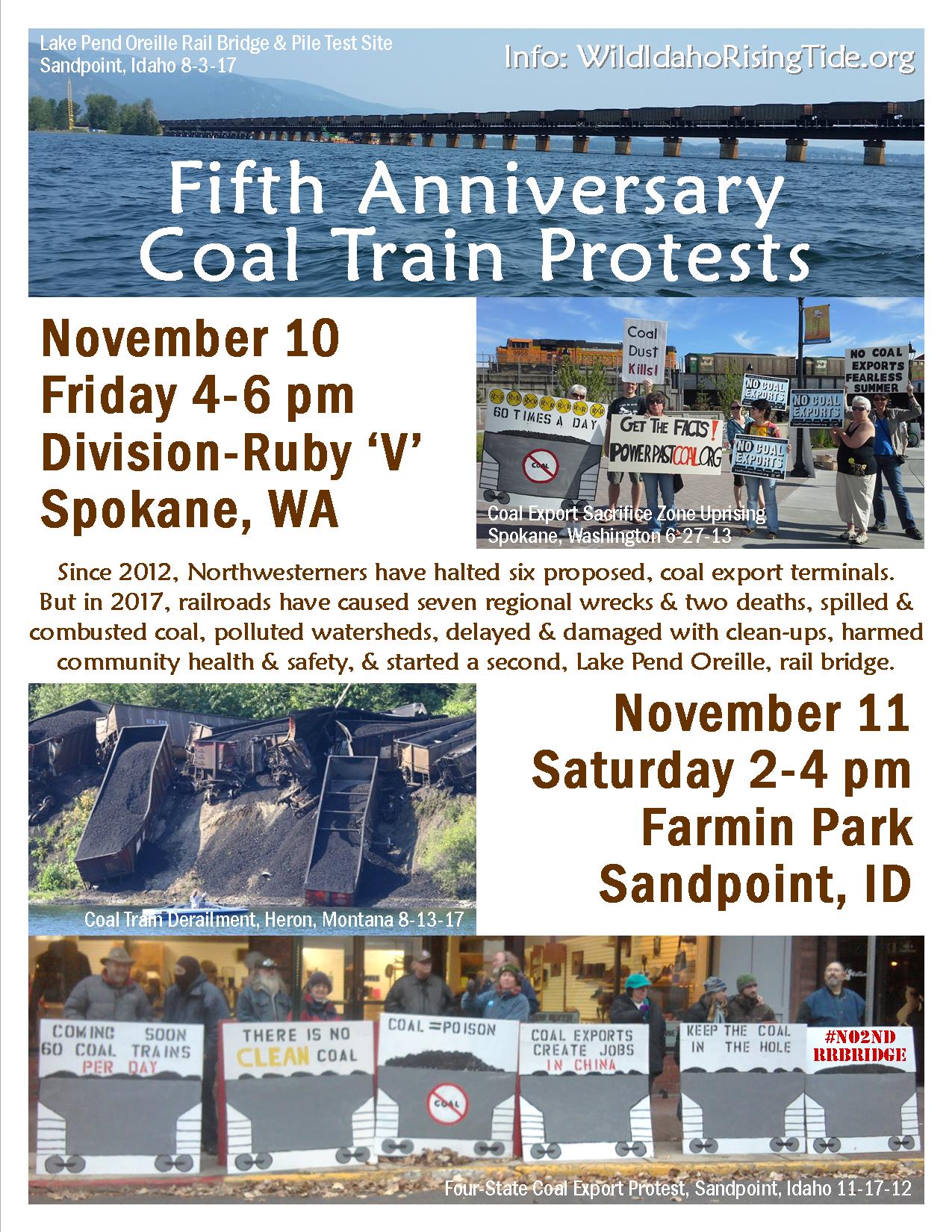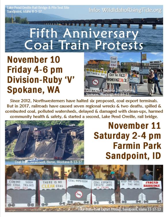 Please join climate activist collective Wild Idaho Rising Tide (WIRT) and regional allies for Fifth Anniversary Coal Train Protests on Friday, November 10, from 4 to 6 pm, at the North Division & Ruby Streets ‘V’ in Spokane, Washington, and on Saturday, November 11, from 2 to 4 pm, meeting at Farmin Park to protest elsewhere in Sandpoint, Idaho. Dress warmly and bring your friends, family, neighbors, voices, drums, musical instruments, and signs and banners addressing coal, fossil fuel, and railroad industry impacts on people, places, and the planet. WIRT will provide pizza, beverages, and safe, direct action opportunities at these public demonstrations commemorating the first, November 2012, coal train and terminal protest in Sandpoint, organized by Moscow, Sandpoint, and Spokane activists [1, 2].