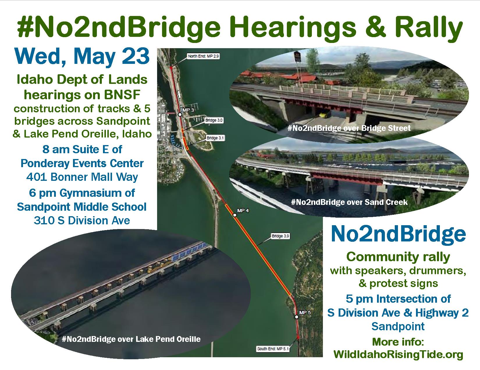 Please join Wild Idaho Rising Tide (WIRT) and #No2ndBridge allies in halting BNSF’s track and bridge expansion proposal: We need everyone on this frontline! Bring your best ideas, energies, comrades, and protest signs to a community resistance rally, with speakers and drummers at 5 pm on Wednesday, May 23, at the intersection of South Division Avenue and U.S. Highway 2 in Sandpoint. Attend and testify at one or both Idaho Department of Lands (IDL) hearings on the same day, at 8 am PDT in Suite E of the Ponderay Events Center, 401 Bonner Mall Way in Ponderay, and at 6 pm PDT in the Sandpoint Middle School gymnasium, 310 South Division Avenue in Sandpoint. Reasonably demand that IDL and the U.S. Coast Guard (USGC), who will also take public comments at these state meetings, respectively deny permits for lakebed encroachments, like temporary and permanent bridge piles, and for bridges across Sand Creek and Lake Pend Oreille.