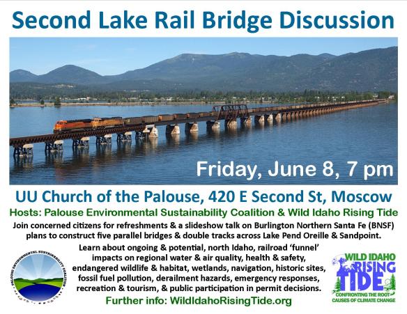 At 7 pm on Friday, June 8, please join Palouse Environmental Sustainability Coalition (PESC), Wild Idaho Rising Tide (WIRT), and concerned community members and activists for refreshments, an open meeting, and a slideshow presentation about Burlington Northern Santa Fe (BNSF) Railway plans to construct two temporary and three permanent, parallel bridges and two miles of doubled tracks across Lake Pend Oreille, Sand Creek, and Sandpoint, Idaho. PESC and WIRT event hosts will provide snacks, offer printed material, and accept admission donations at this free event that opens at 6:30 pm, at the Unitarian Universalist Church of the Palouse, 420 East Second Street in Moscow.