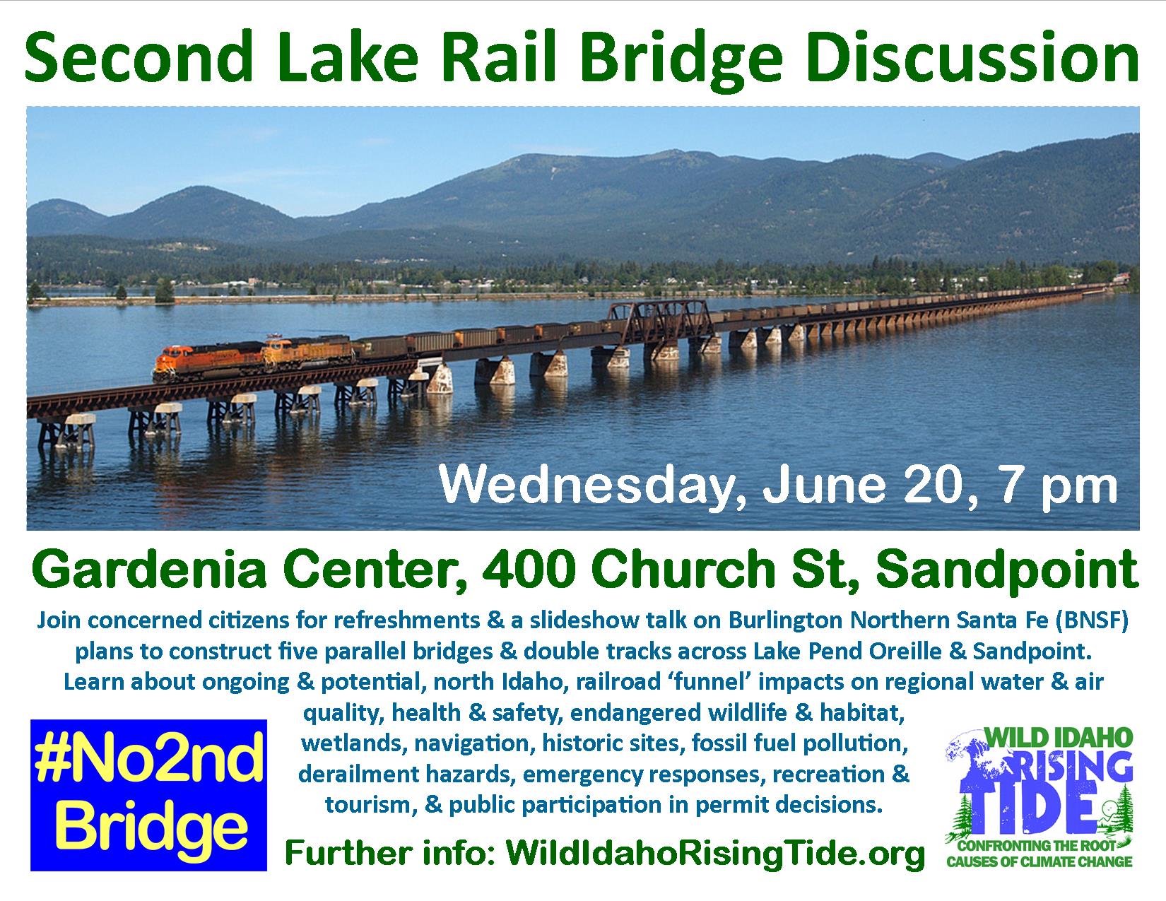 At 7 pm on Wednesday, June 20, please join #No2ndBridge and Wild Idaho Rising Tide (WIRT) activists and concerned, community members for refreshments and a Second Lake Rail Bridge Discussion and slideshow presentation, at the Gardenia Center, 400 Church Street in Sandpoint. Event hosts of this free, open meeting invite participants to bring and share snacks, stories, images, and donations, and learn about the natural and human environment of Lake Pend Oreille, the ongoing and potential traffic, pollution, and derailment dangers of fossil fuel and hazardous freight trains, and the flawed infrastructure, earthquake resilience, and emergency response capacity of the north Idaho, railroad ‘funnel.’