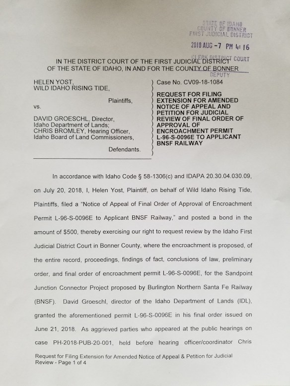 On Tuesday, August 7, Wild Idaho Rising Tide (WIRT) filed pro se (without attorney representation again) a request for an extension of at least 14 days to file an amended notice of appeal of the Idaho Department of Lands’ (IDL) June 21 final order approving an encroachment permit for Burlington Northern Santa Fe Railway’s (BNSF) Sandpoint Junction Connector application to build two temporary work spans and two permanent railroad bridges in Lake Pend Oreille and Sand Creek. The extension request also covers filing a petition for judicial review by the Idaho First District Court in Bonner County, of the entire, almost 1000-page, public record culminating in the state permit decision, based on the preliminary and final orders of Idaho Board of Land Commissioners hearing officer Chris Bromley and IDL director David Groeschl, the lawsuit defendants.