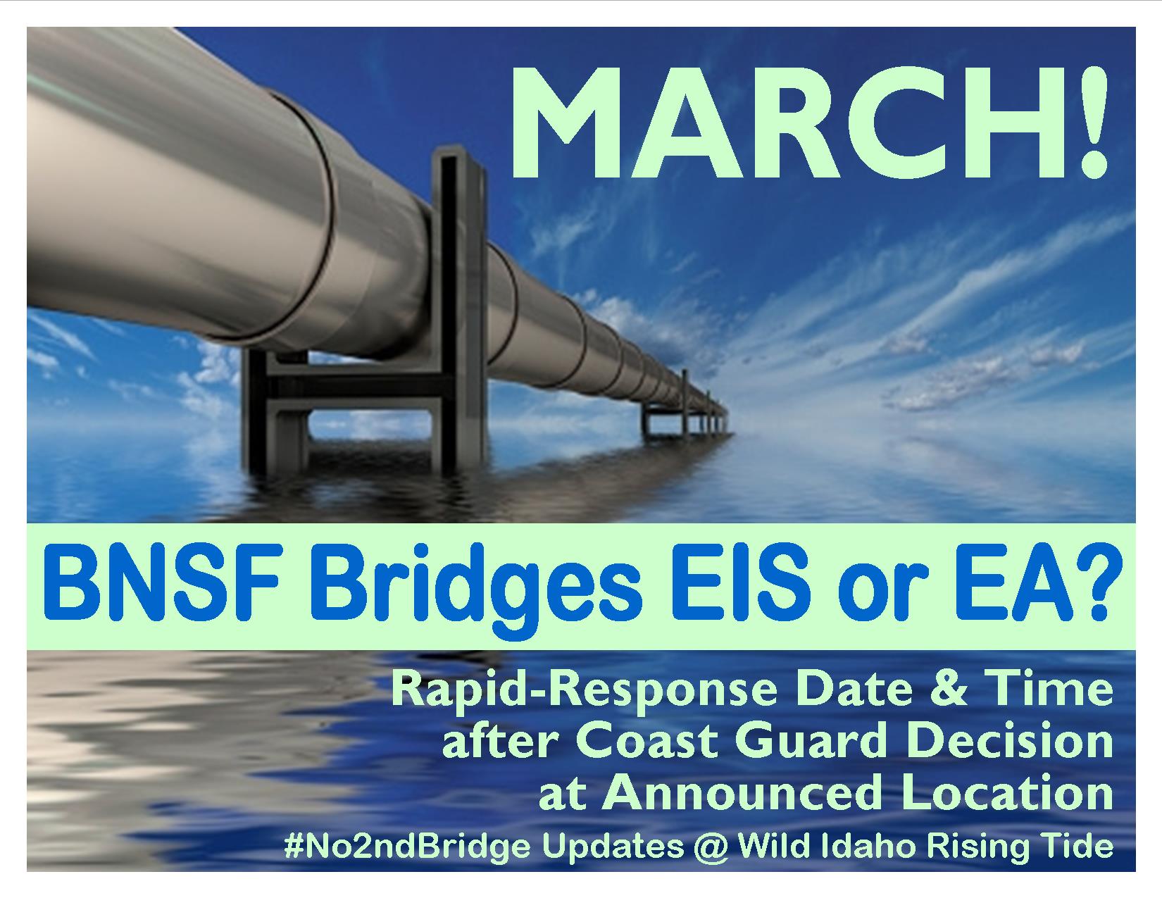 Thanks to each of you for your diligent, ongoing, resistance work on the north Idaho, Burlington Northern Santa Fe (BNSF) Railway bridge expansion issue! Since Wild Idaho Rising Tide’s (WIRT) #No2ndBridge Protest #3 and the extended, U.S. Coast Guard (USCG), draft environmental assessment (EA) comment deadline on May 1, WIRT board members, activists, and allied groups have been scheming a Sandpoint area march on an unknown but rapid-response date [*]. The march will either celebrate the still undetermined, Coast Guard decision to recommend a full environmental impact statement (EIS) studying the implications of BNSF’s proposed railroad bridges across Lake Pend Oreille, Sand Creek, and Sandpoint, or protest USCG issuance of a finding of no significant impact (FONSI) and less scientifically rigorous, final EA.