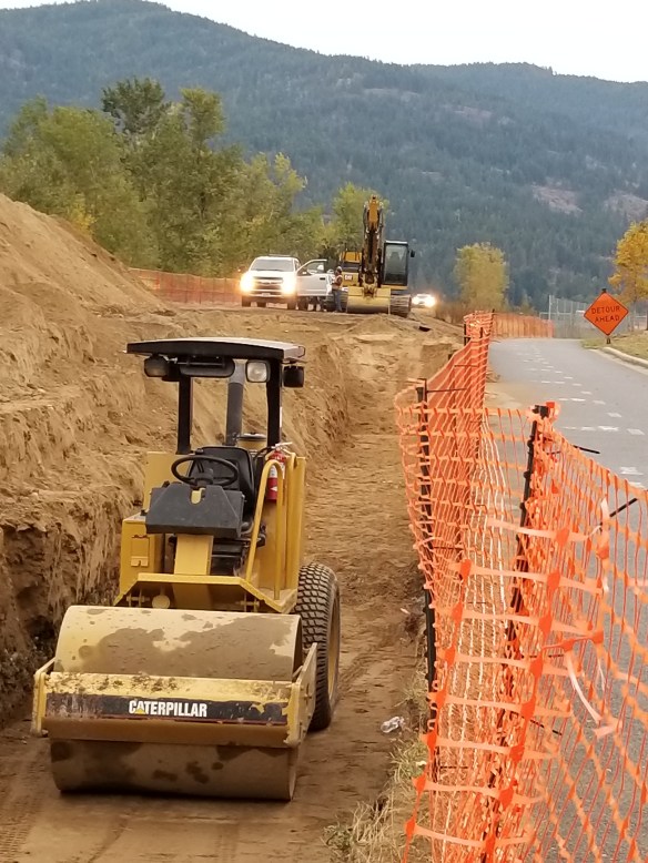Between single train tracks to the east, and the multi-use Serenity Lee Trail to the west, a large bulldozer has placed several, long, huge piles of fine, sandy soil, shoveled out of a trailside, square ditch by two small bulldozers. Despite the close proximity of these piles and other site preparations to a large, forested wetland flowing into the north side of Sand Creek and its Lake Pend Oreille outlet and bull trout critical habitat, stakes labeled “silt fence” do not bear this required, preventative measure. WIRT complained on October 7 to on-site, BNSF workers, and on October 10 to City of Sandpoint staff, about soil piles risking sediment pollution and water drainage disruption of wetlands, floodplains, and the creek and lake, especially if EIS-insisting lawsuit(s) postpone project progress during windy and wet winters and springs. On the almost-full moon evening of October 11, we noticed a water truck parked with the second large bulldozer, inside the site fence near Dog Beach Park. It had likely, earlier dampened the trail and freshly dug ditch but not soil piles, while the large, Earth-moving equipment, night-lit by a half-dozen Highway 95 lights, had stopped short of a second, heavily staked but not silt fenced wetland south of the piles, perhaps due to the still unissued, Army Corps permit. From Dog Beach Park within the BNSF right-of-way and Idaho Transportation Department lands around Serenity Lee Trail, we also viewed some BNSF activity at the south end of the current, rail bridge.