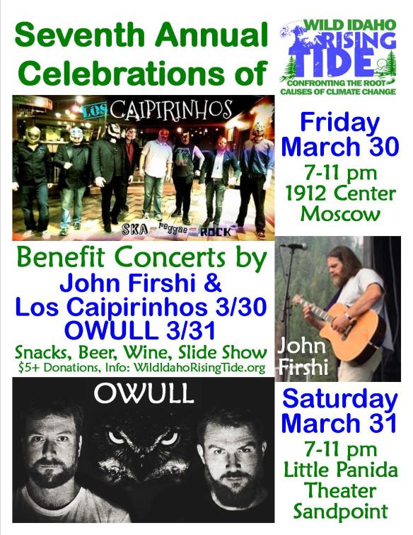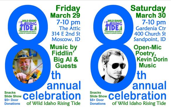 Wild Idaho Rising Tide (WIRT) is celebrating its March 31 anniversary and fourteenth year as a regional, climate activists collective confronting the root causes and perpetrators of air pollution, water degradation, and resulting climate change, through direct actions and locally organized solutions, in solidarity with frontline communities and grassroots networks of fossil fuels resistance [1-6]. We welcome everyone of all ages to enjoy this milestone at two 14th Annual Celebrations of WIRT, held as benefit performances and public gatherings in Moscow and Sandpoint, Idaho, with provided pizza or pub snacks and beverages, a background slide show of WIRT and allied activism, and updates on six Northwest campaigns. WIRT extends our hearty thanks to the remarkable core activists, board members, friends, and allies who have coordinated and shared the successes of ongoing citizen challenges of the corporate and government sources of climate chaos.