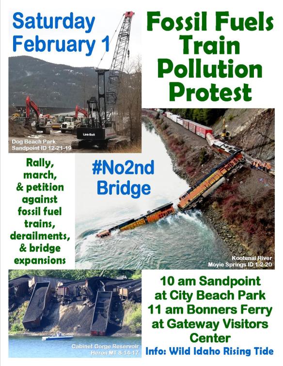 Wild Idaho Rising Tide (WIRT) and allied activists, friends, and supporters heartily welcome your participation in the upcoming, Sixth Panhandle Paddle weekend of opportunities to discuss, train for, and stage resistance to the fossil fuels and railroad industry degraders of human rights, environmental health, and the global climate. Interior Northwest residents are coordinating and co-hosting annual activities in Sandpoint, Idaho, to unite in opposition to regional coal, oil, and tar sands trains, terminals, and derailments and Burlington Northern Santa Fe (BNSF) Railway’s commenced, #No2ndBridge, track and bridge construction across downtown Sandpoint, Sand Creek, and Lake Pend Oreille. Amid the intensifying situations of north Idaho railroad expansion, federal and media criminalization of dissenters, private militia invasions of Black Lives Matter protests, and COVID-19 health and economic disasters during the last year, we are reaching out to you, our regional network comrades, to share direct action skills and invite you to join with rail line communities, to protest fossil-fueled climate change via these free events on Friday through Sunday, September 18 to 20. We would appreciate your involvement in the talk, workshop, and paddle, your RSVP of your intentions for spots in kayaks, canoes, and carpools, and your assistance with distributing this event description and printing and posting the color, PDF version of the WIRT website-linked Sixth Panhandle Paddle Flyer 2.