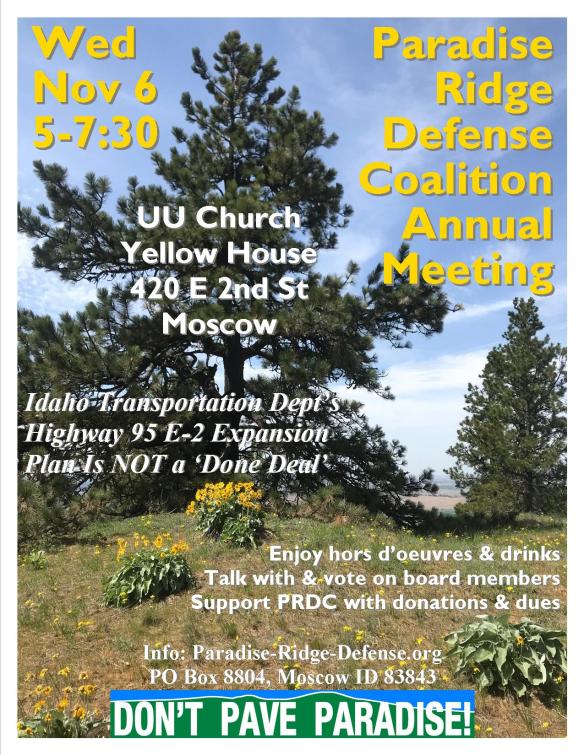 From 10 am until 12 noon on Saturday, April 20, community members are meeting at the south parking lot and barn of the University of Idaho Arboretum and Botanical Garden, 1200 West Palouse River Drive in Moscow, to attend a guided walk up Paradise Ridge with representatives of the Paradise Ridge Defense Coalition (PRDC) [3, 4]. Over the last three decades, PRDC has refuted deficient, Idaho Transportation Department (ITD) environmental studies and applications and has delayed flawed ITD attempts to realign U.S. Highway 95 between Thorn Creek Road and Moscow, on this ridge that hosts some of the last, significant remnants of native Palouse Prairie. Through four court challenges, expert wetland analyses, public records requests, and a lawsuit settlement, PRDC has forced suspension of wetland damage permits that ITD later revised and the U.S. Army Corps of Engineers approved during 2023. As contested construction activities resume on Paradise Ridge, walk participants intend to share information about this ongoing preservation campaign and to collectively witness and grieve the degradation of this globally endangered ecosystem.